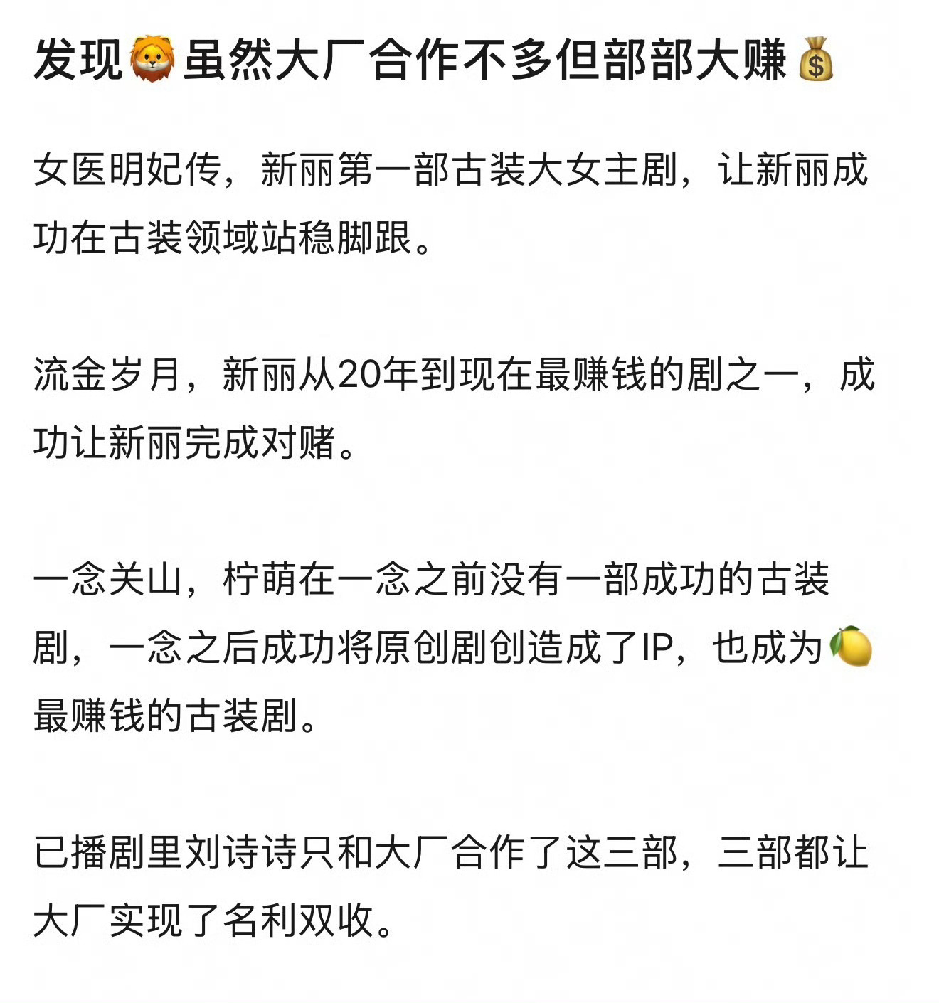 这些大厂,刘诗诗和新丽合作过《女医明妃传》,《流金岁月》两部都台网双爆,上了财报