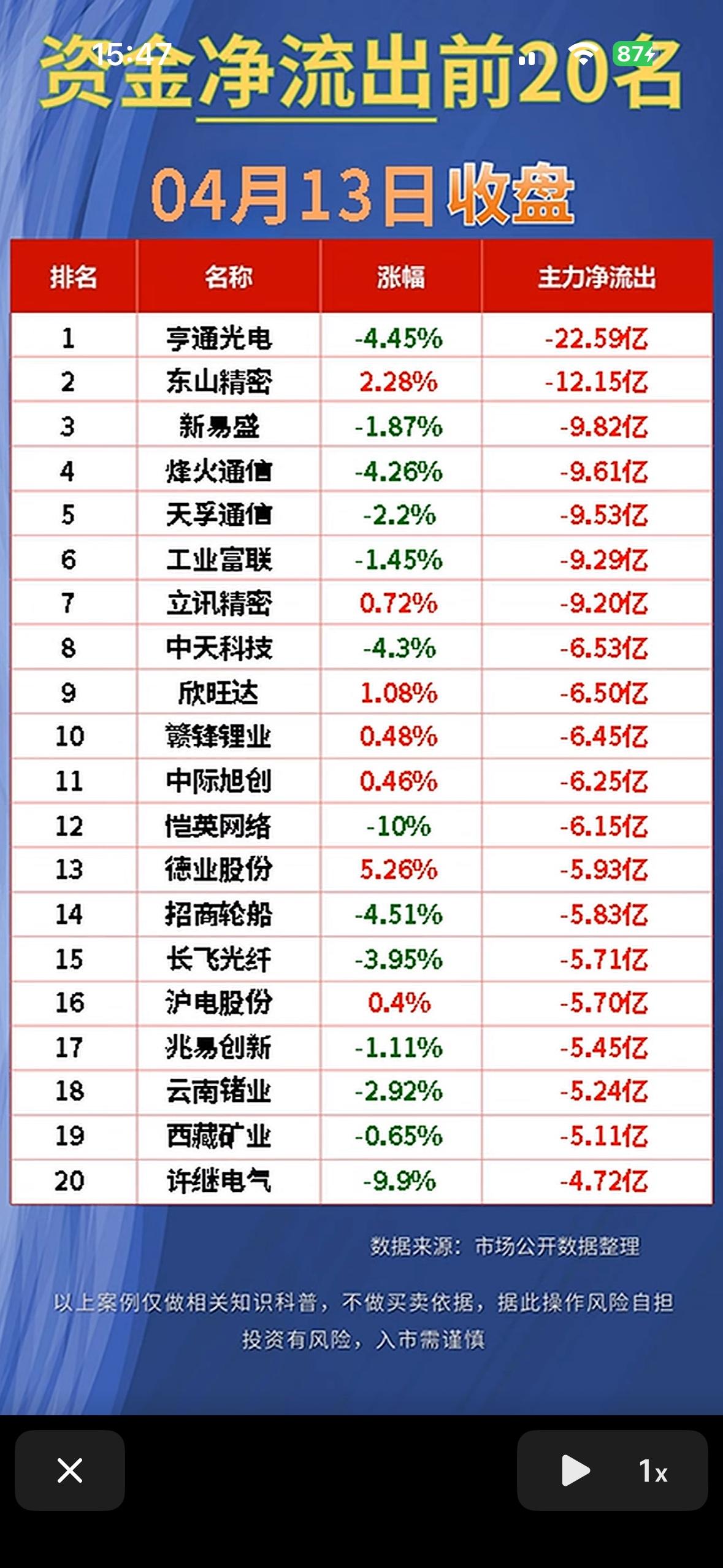 4月13资金净流入与净流出前20名,4月13日收盘数据,谨慎投资!