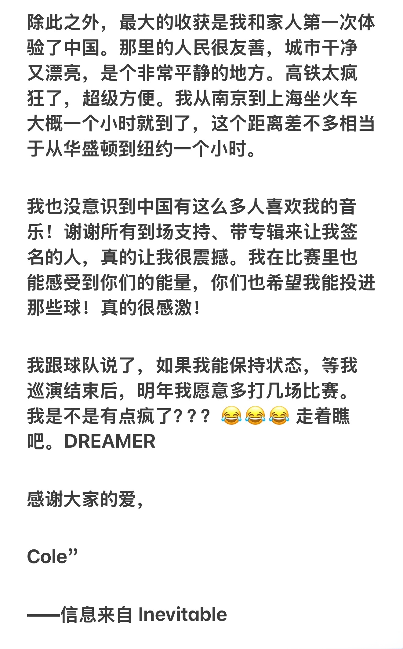 J.Cole因为签证和工作原因将缺席后续比赛,准备飞回美国。J.Cole昨晚上演