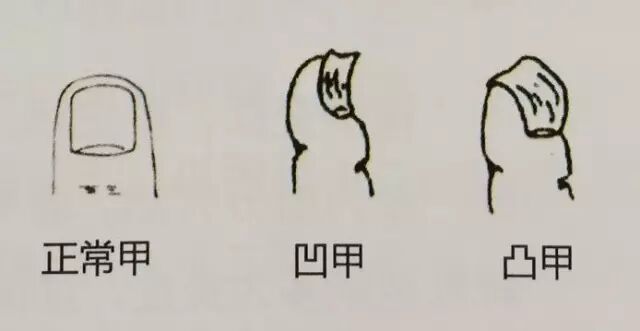 凸甲,特征是甲面中央明显凸起高于四周,甲端部下垂,像贝壳或倒覆的汤勺,甲板与甲床分离,指甲呈空壳状。易患慢性病症,如肺痨病,多属肺阴不足。