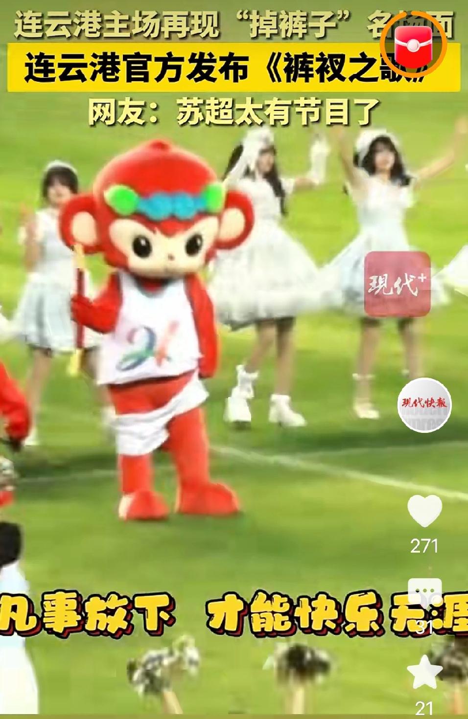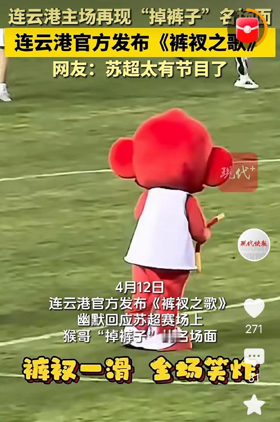 网友说,连云港输球的一半责任在这只红猴子。开幕式当晚猴嘟嘟上场后,才扭了两分钟,裤衩就掉下去了,提起来又掉,提起来又掉,三十分钟的表演,摆弄了二十八分钟裤衩子,手上的牙签金箍棒到是握的牢牢的,巡游的时候,现场的观众喊,你裤衩掉了,你裤衩掉啦,恨不得冲到台上帮它提起来。