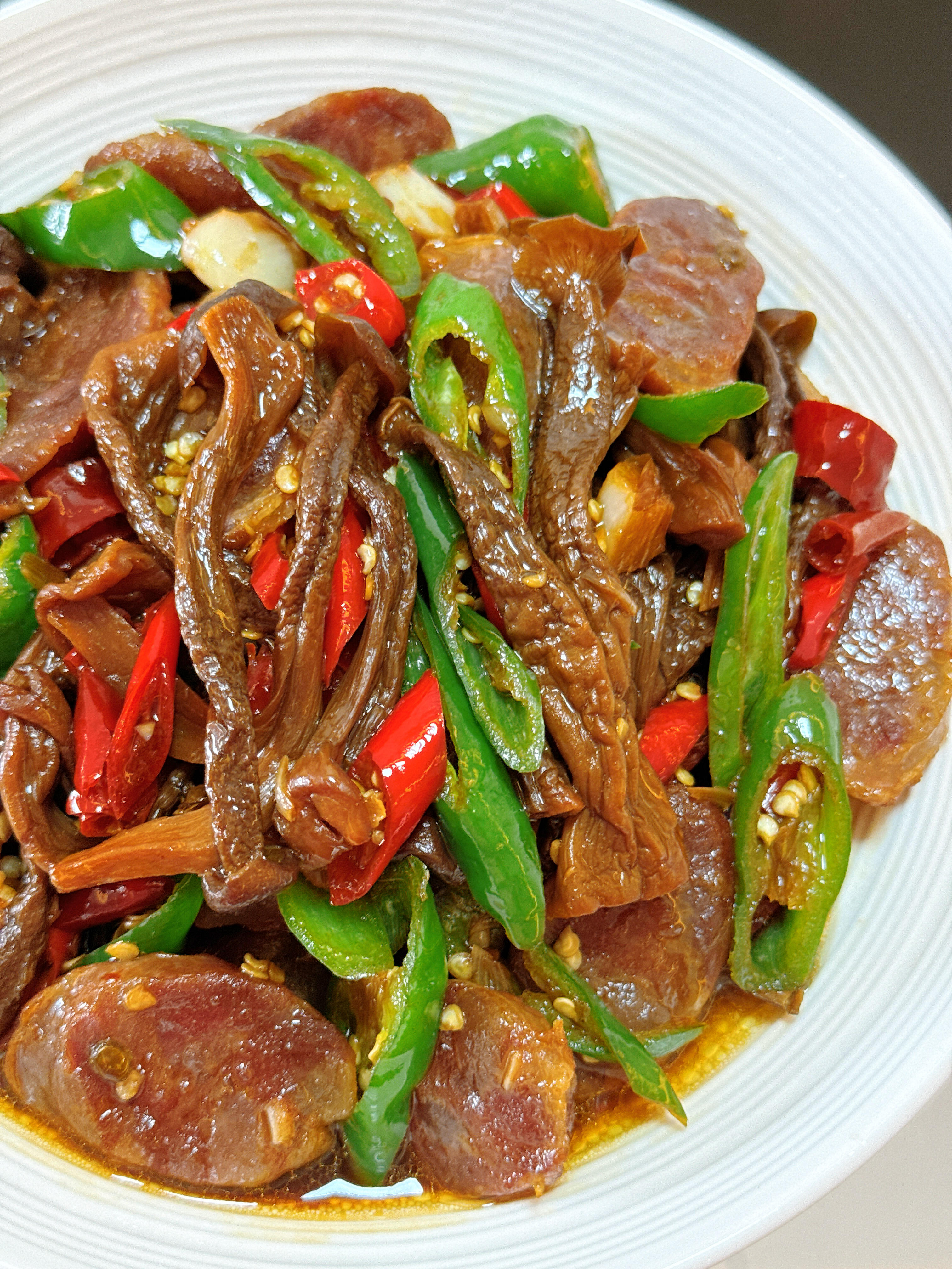 真心夸爆这道菜!鹿茸菇怎么做都好吃,搭配腊肠和辣椒一起炒,鲜辣爽脆,每一口都入味,家常吃、待客都超合适,赶紧动手试试~