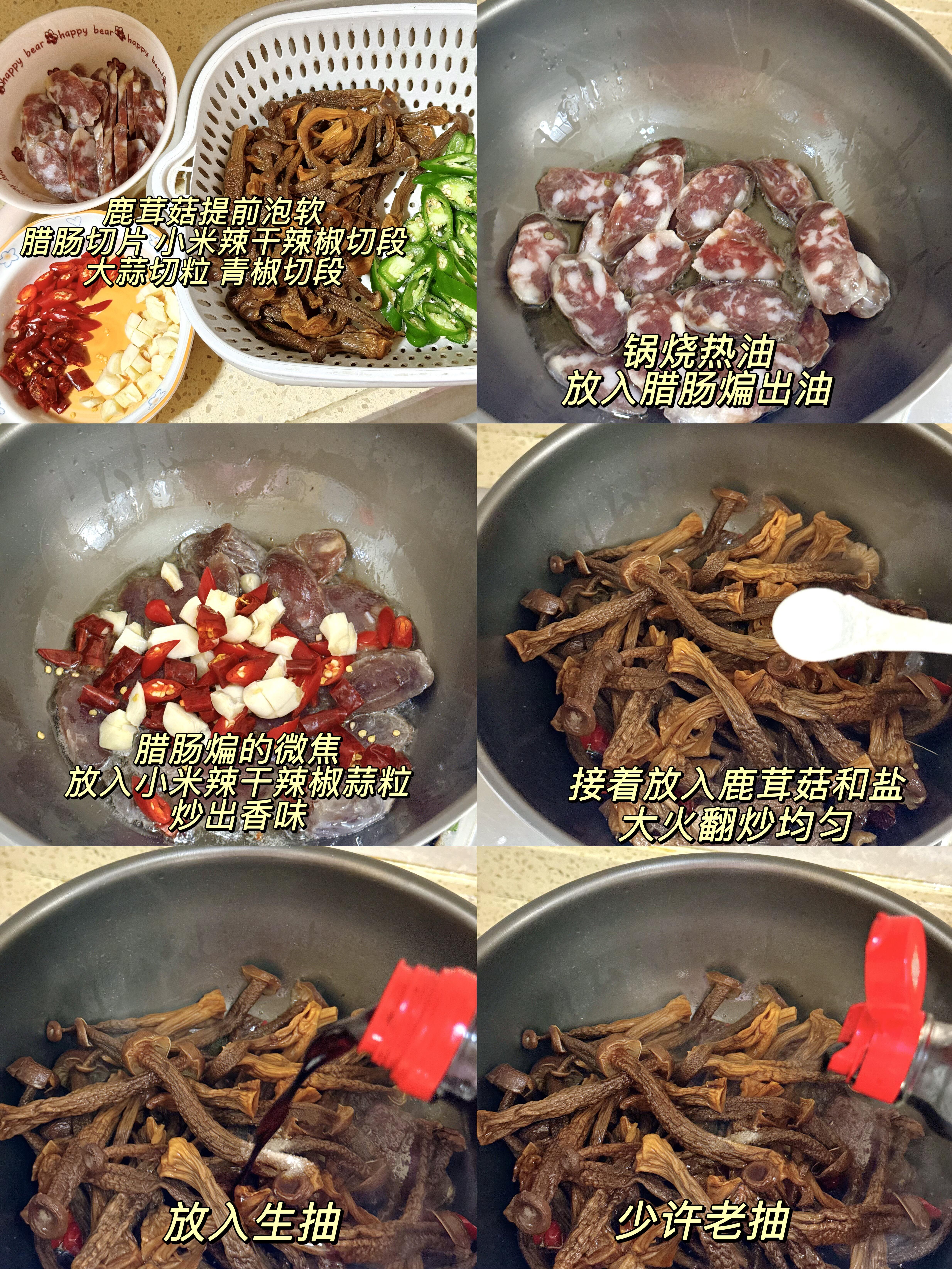 1️⃣ 鹿茸菇提前泡发好,沥干水分备用;腊肠切成薄片,干辣椒、小米辣切段,大蒜切成蒜粒,青椒切成段,食材提前备好更省时间。