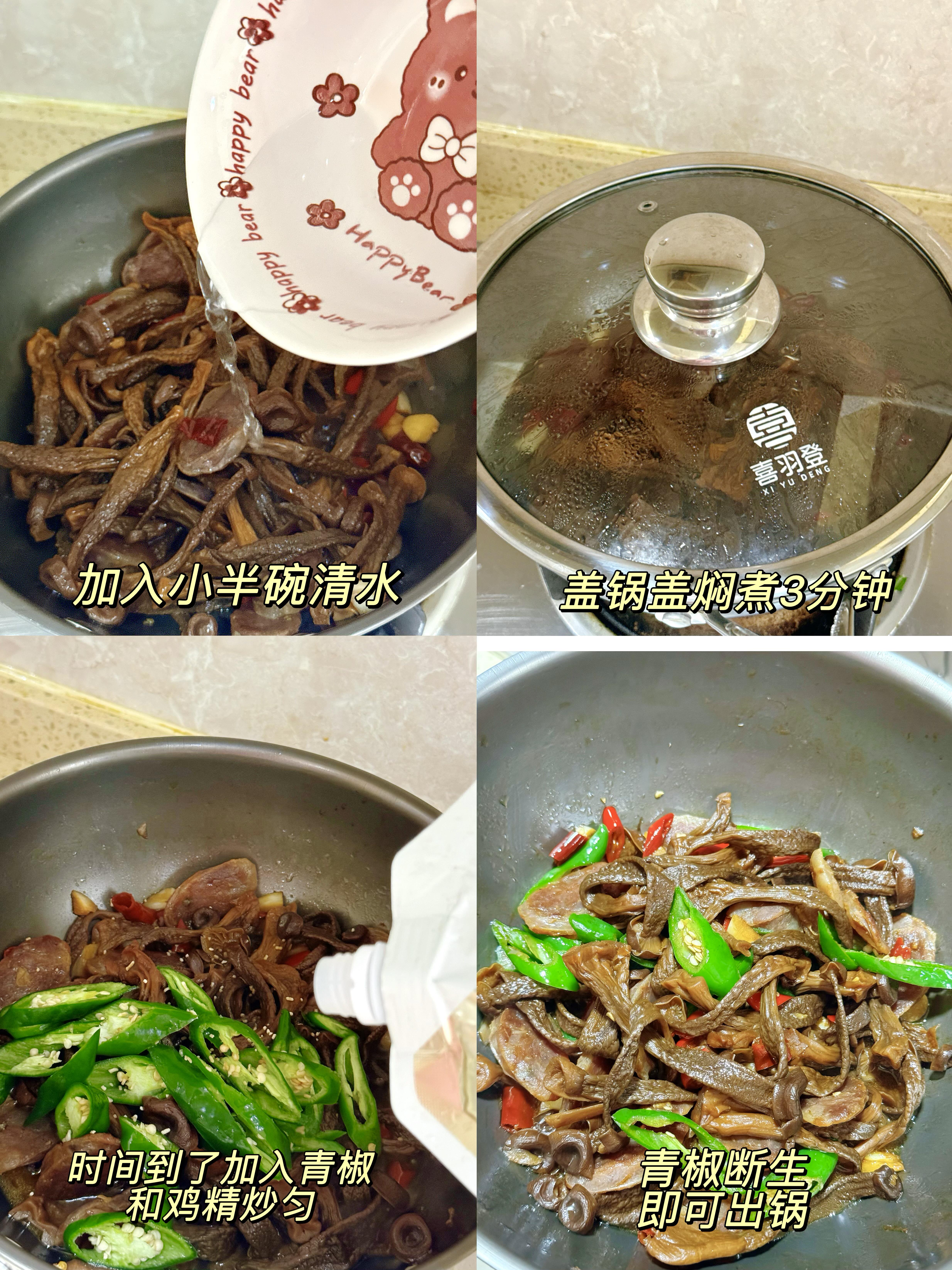 3️⃣ 倒入半碗清水,盖上锅盖,转小火焖煮3分钟,让鹿茸菇吸饱汤汁、变得更脆嫩;时间到后,放入切好的青椒,加少许鸡精,转大火翻炒,炒至青椒断生、汤汁微微浓稠,就能出锅啦!