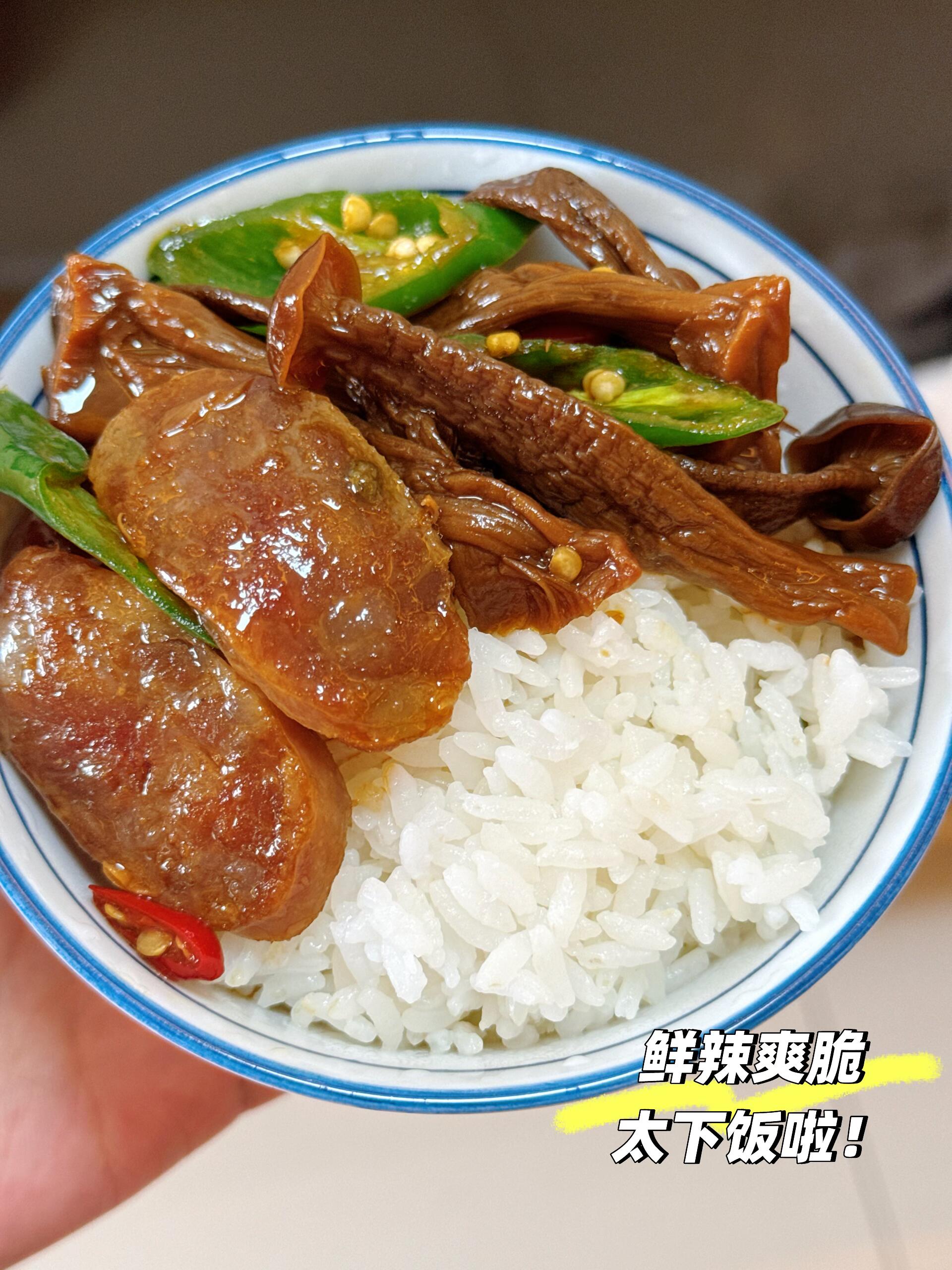 腊肠的咸香油脂香,裹着鹿茸菇的脆嫩鲜香,再搭配青红椒的鲜辣提味,三者完美融合,一口下去鲜脆爽口、咸香不腻,香到直跺脚,直接封神✨ 妥妥的干饭神器,有它在,再也不用愁没胃口!