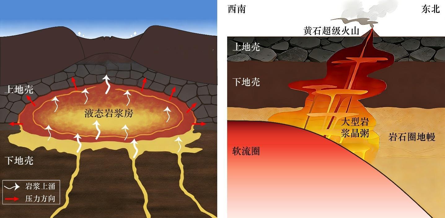 模型预测,在黄石火山下方,快速向东漂移的软流圈(地幔风)穿过狭窄的大陆岩石圈通道时,上升的热物质与下潜的地幔流之间相互拉扯,导致减压熔融,产生大量幔源岩浆。