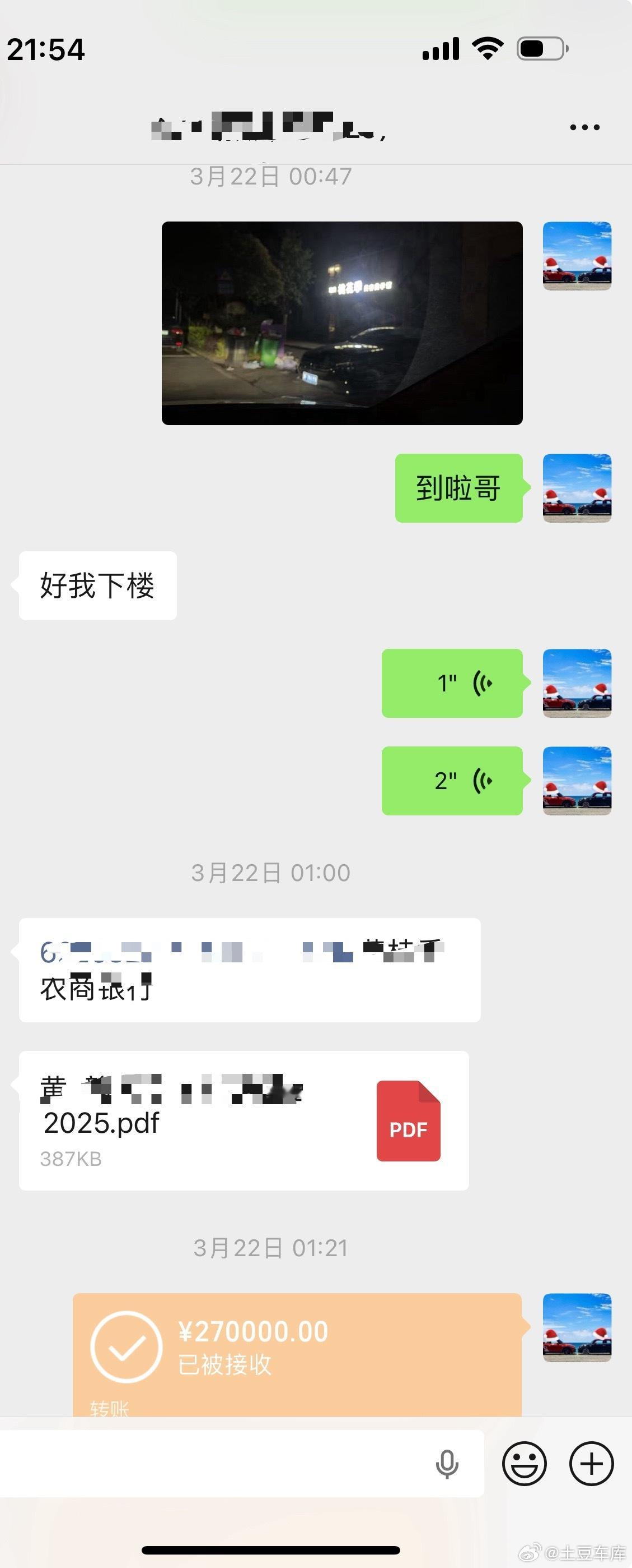 当天晚上凌晨过去收车 银行系统在维护 没办法转账 微信可以转账 但是钱不够后来找朋友挪了点 27万整给收的这一来一回 路费 检测费用 去掉了小2000块钱