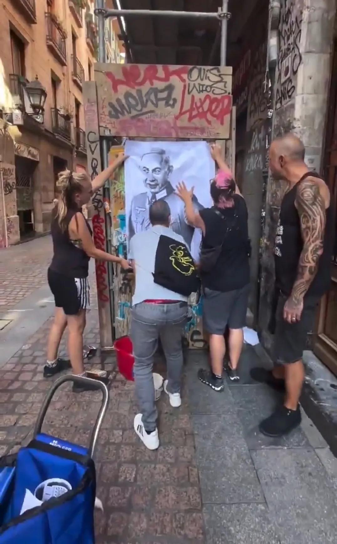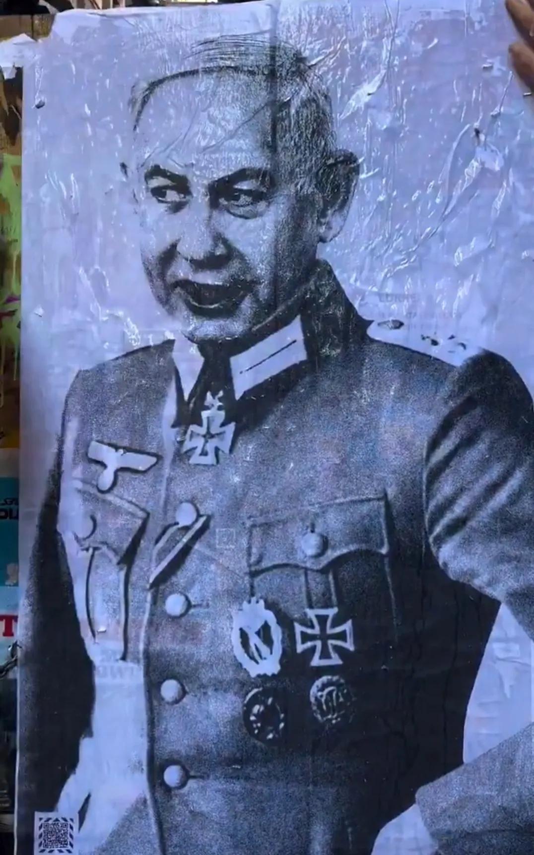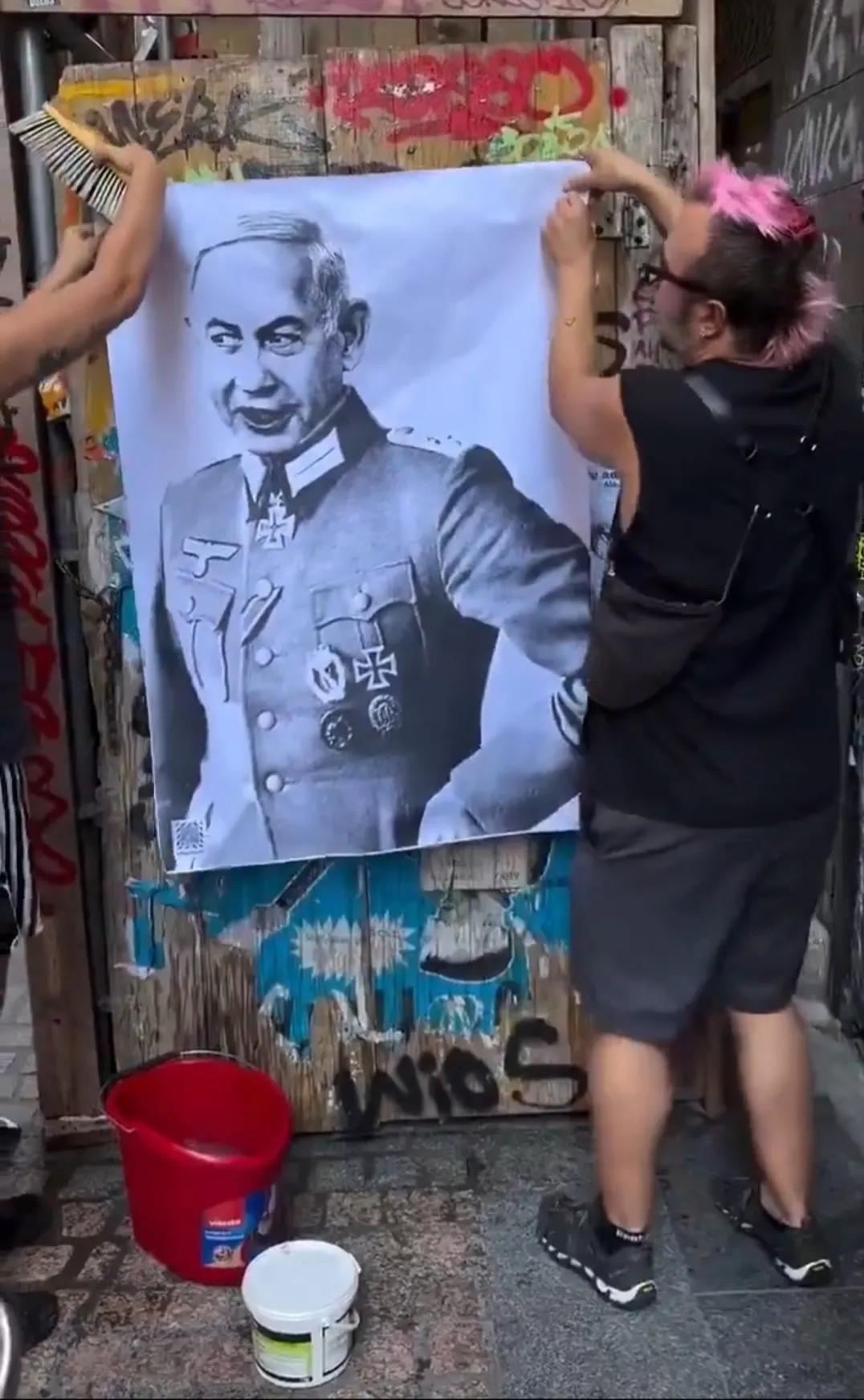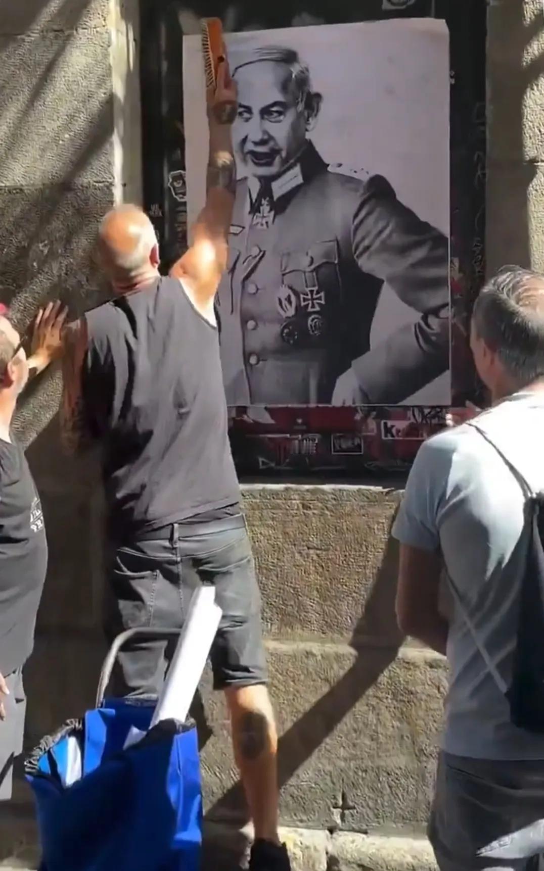 西班牙对以色列的厌恶不光来自高层,主要来自大众。看看,西班牙老百姓将以色列总理内塔尼亚胡画成二战时期纳粹德军的扮相,在大街小巷张贴这种海报,让更多的人看清楚犹太复国主义者和纳粹是一样的货色。
