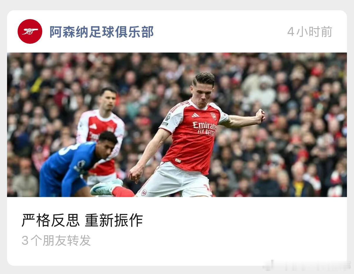阿森纳官方公众号的本地化做得非常优秀《严格反思 重新振作》《正视自身问题 认清当下处境》