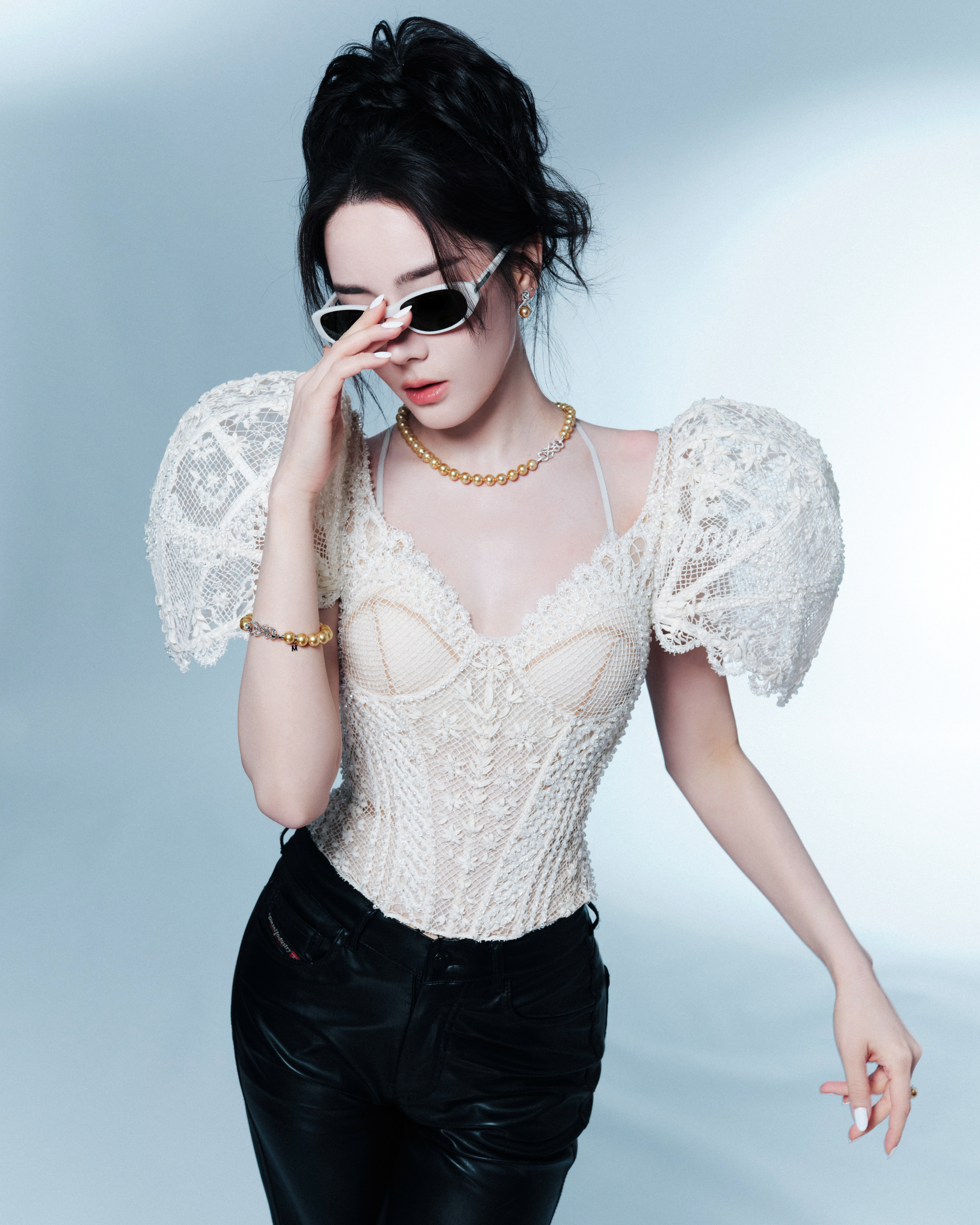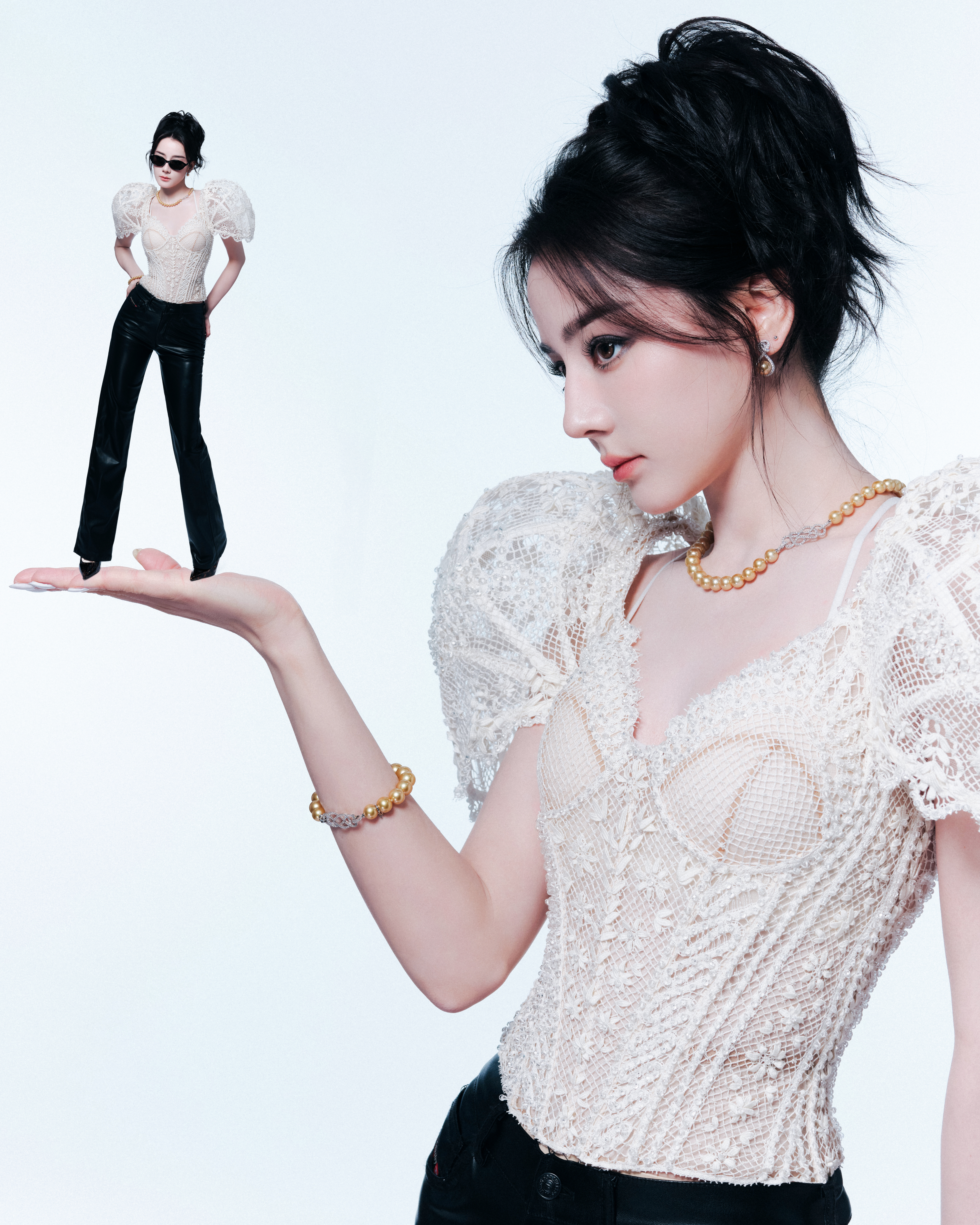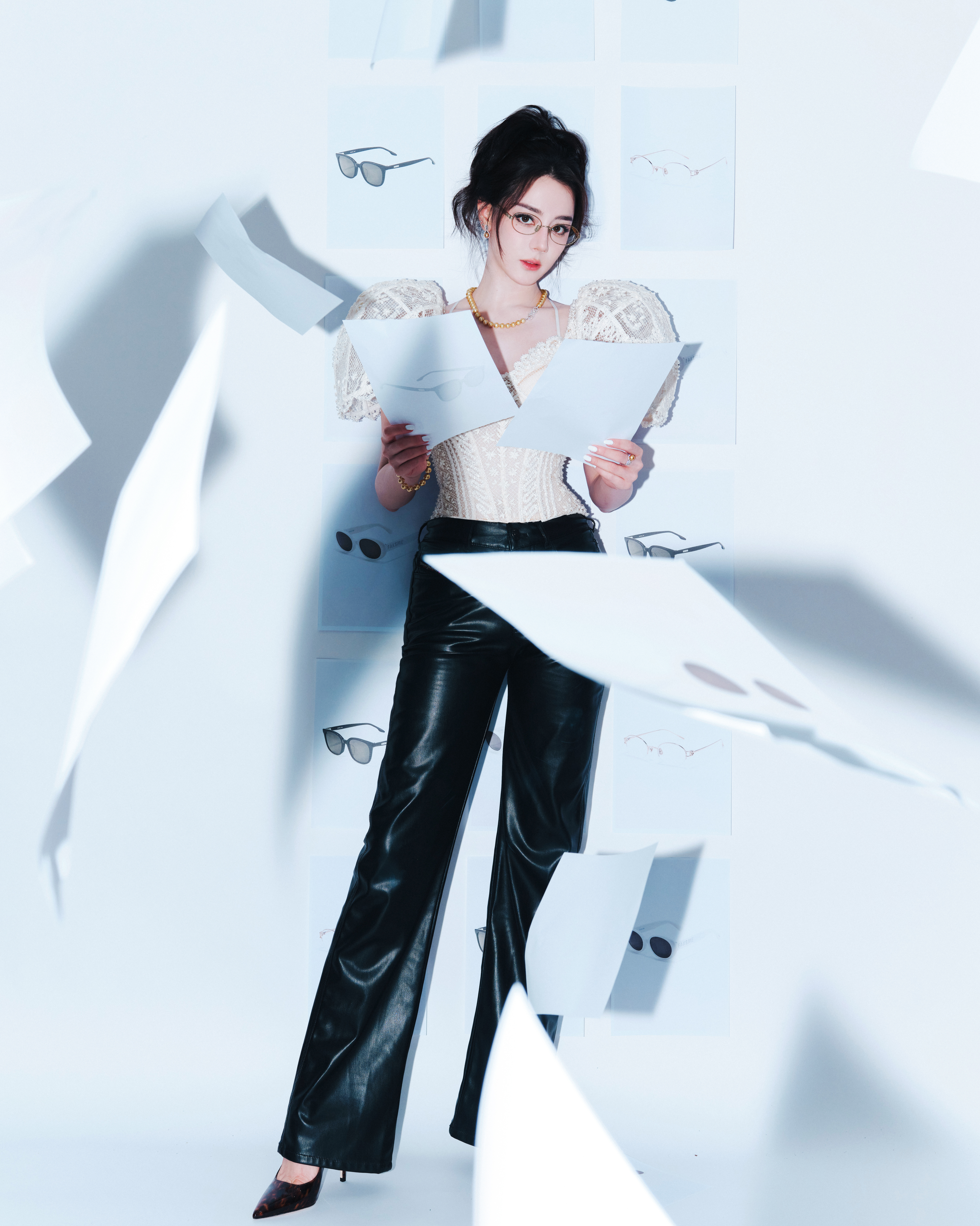 迪丽热巴出席Fakeme品牌直播活动造型图集,带来Ulyana Sergeenko 2026春夏高定时装的全球首穿,蕾丝立体垫肩上装搭配皮质长裤,佩戴Mikimoto御木本珠宝,很有个性的一套Look,今天是又酷又美的Fakeme全球品牌代言人热巴 ~