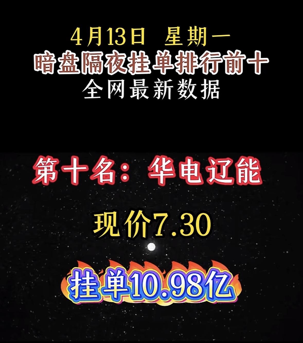 华电辽能最近在暗盘隔夜挂单里可太惹眼了,直接排行前十,现价7.30,挂单高达10.98亿!3月23日时它就很牛,以现价6.26、买单97.66亿位居暗盘隔夜挂单第一名。