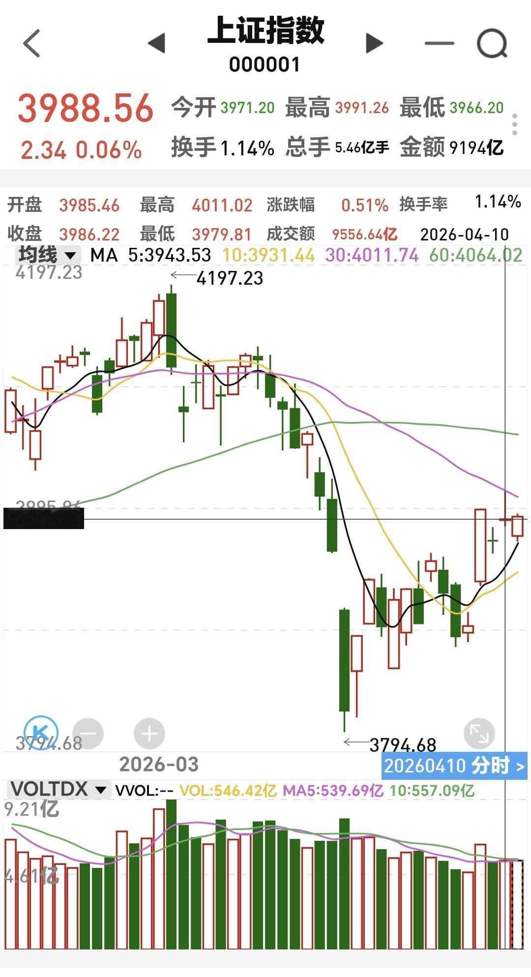从4197点下跌到3794点,花费了15个交易日,从3794点反弹到了昨天花费了14个交易日,从时间上来说,如果现在还是b浪反弹,反弹所剩的时间不多了,这也是我昨天晚上文章里面讲的,今天或者是明天就要进行方向的选择,今天或者是明天要么上涨突破4012点,要么下跌跌破3955点。