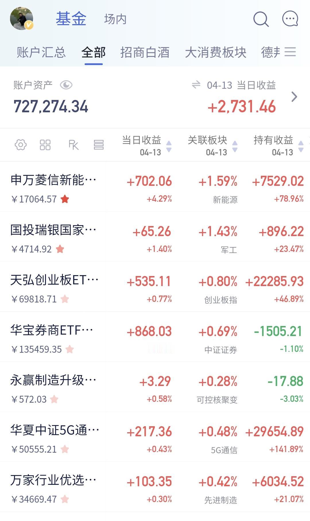 持有的基金中,昨天晚上净值更新以后,上涨幅度最大的三个板块是:新能源汽车板块,军工板块,创业板指,下跌幅度最大的三个板块是:AI应用板块,白酒板块,沪港深消费板块。