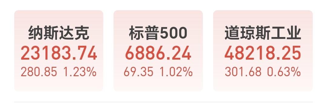 美股市场昨天晚上上涨,纳斯达克指数上涨了1.23%,标普指数上涨了1.02%,道琼斯指数上涨了0.63%,上涨幅度也都不大。