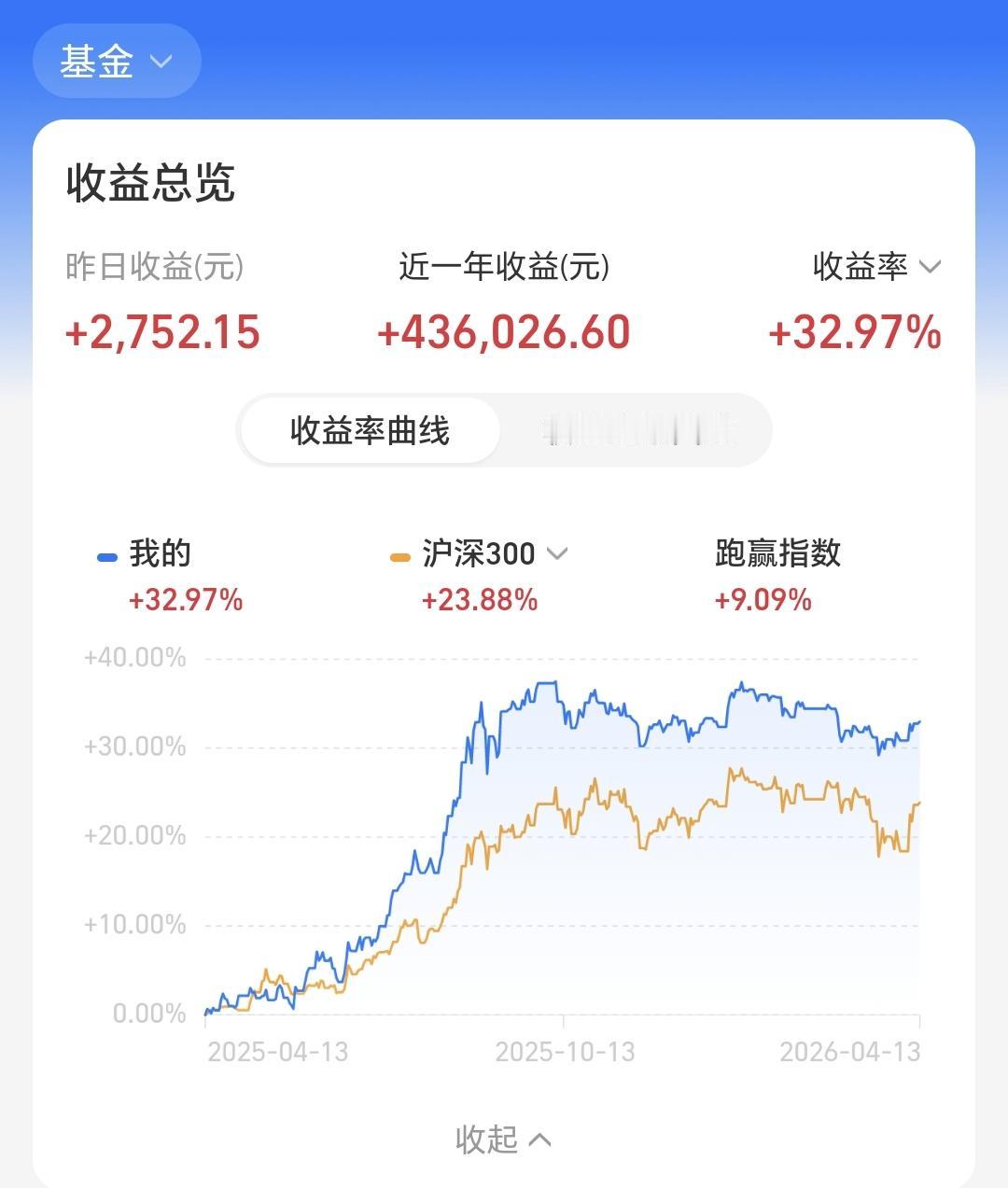 近一年以来收益436026元,收益率32.97%,跑赢了沪深300指数23.88%的上涨幅度。