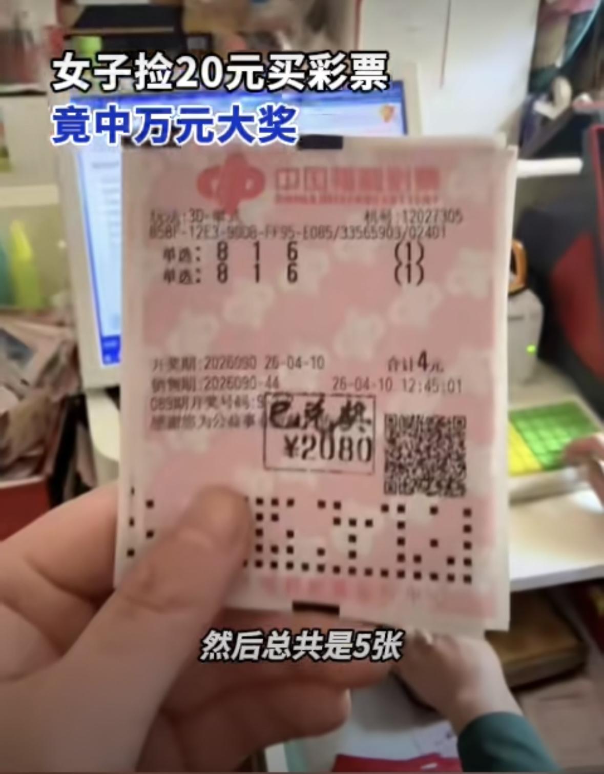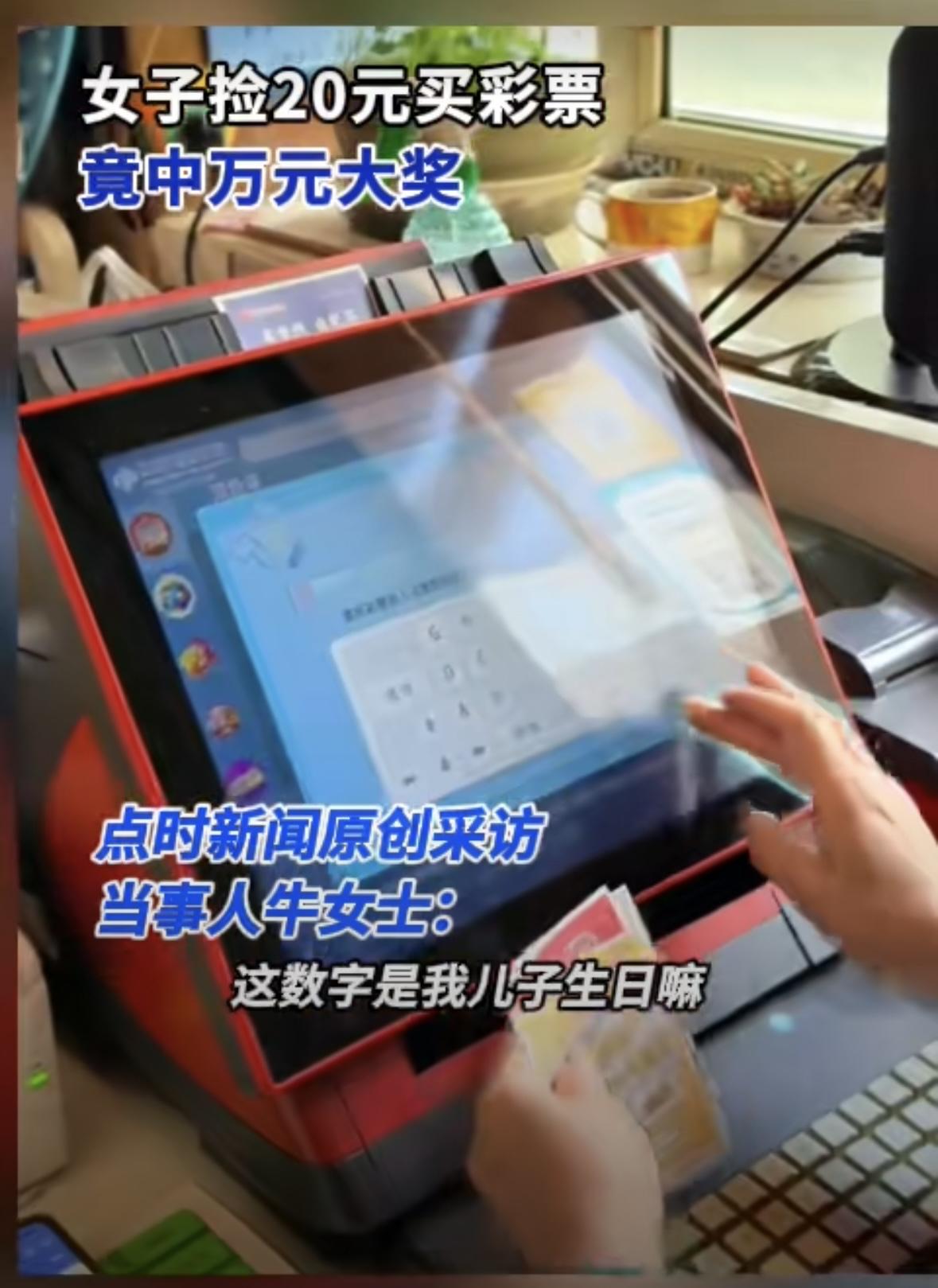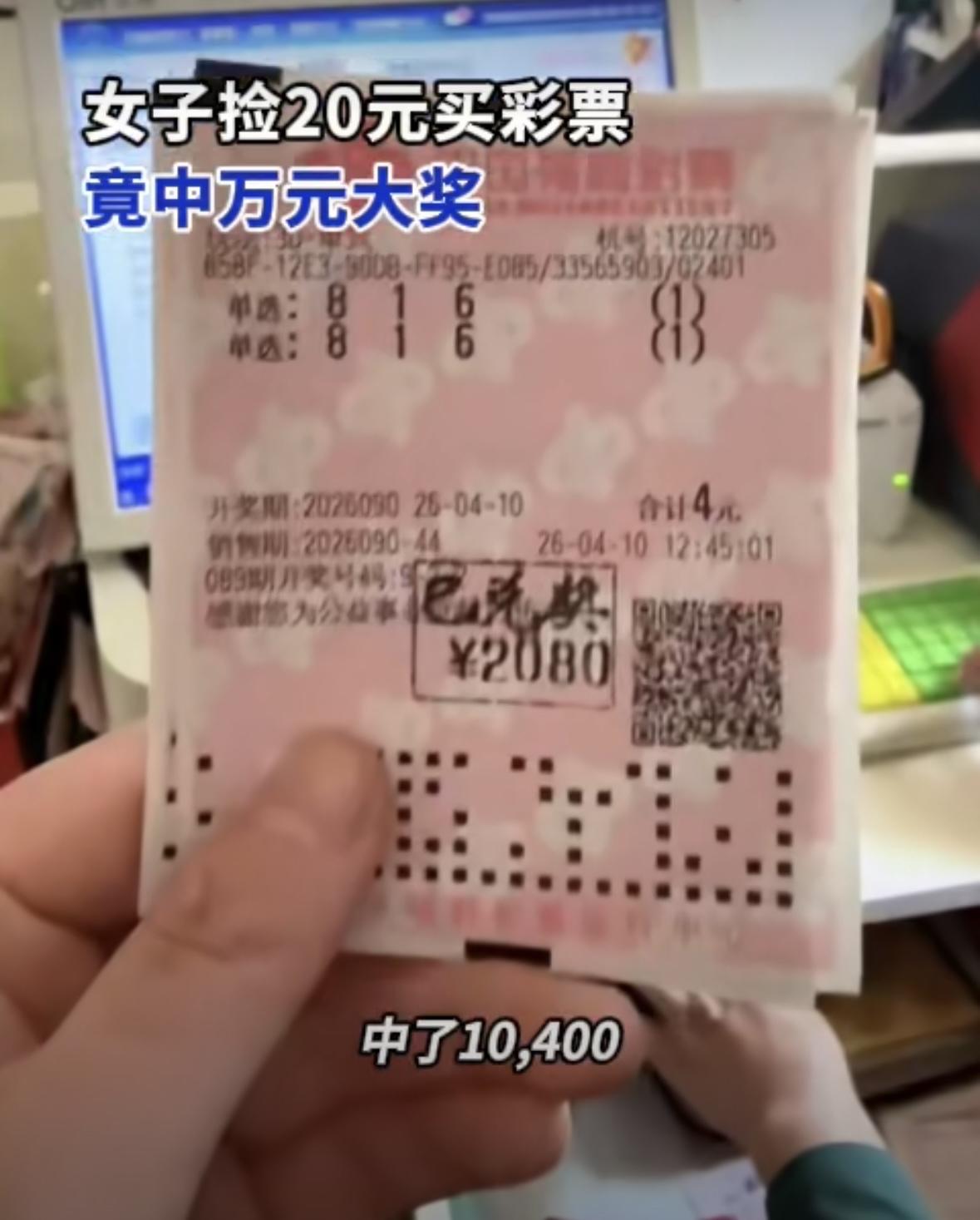 据点石新闻报道,近日,天津的牛女士在外出吃饭的路上偶然捡到了20元钱,她并没有随手花掉,而是灵机一动,走进了一家彩票店,用这笔“意外之财”购买了人生中第一张彩票。由于对选号毫无了解,她干脆用儿子的生日作为号码,买了5张福利3D彩票,每张2注,总共10注。当晚开奖结果揭晓,她惊喜地发现自己竟一举中得10400元大奖,这笔意外惊喜让她喜出望外。