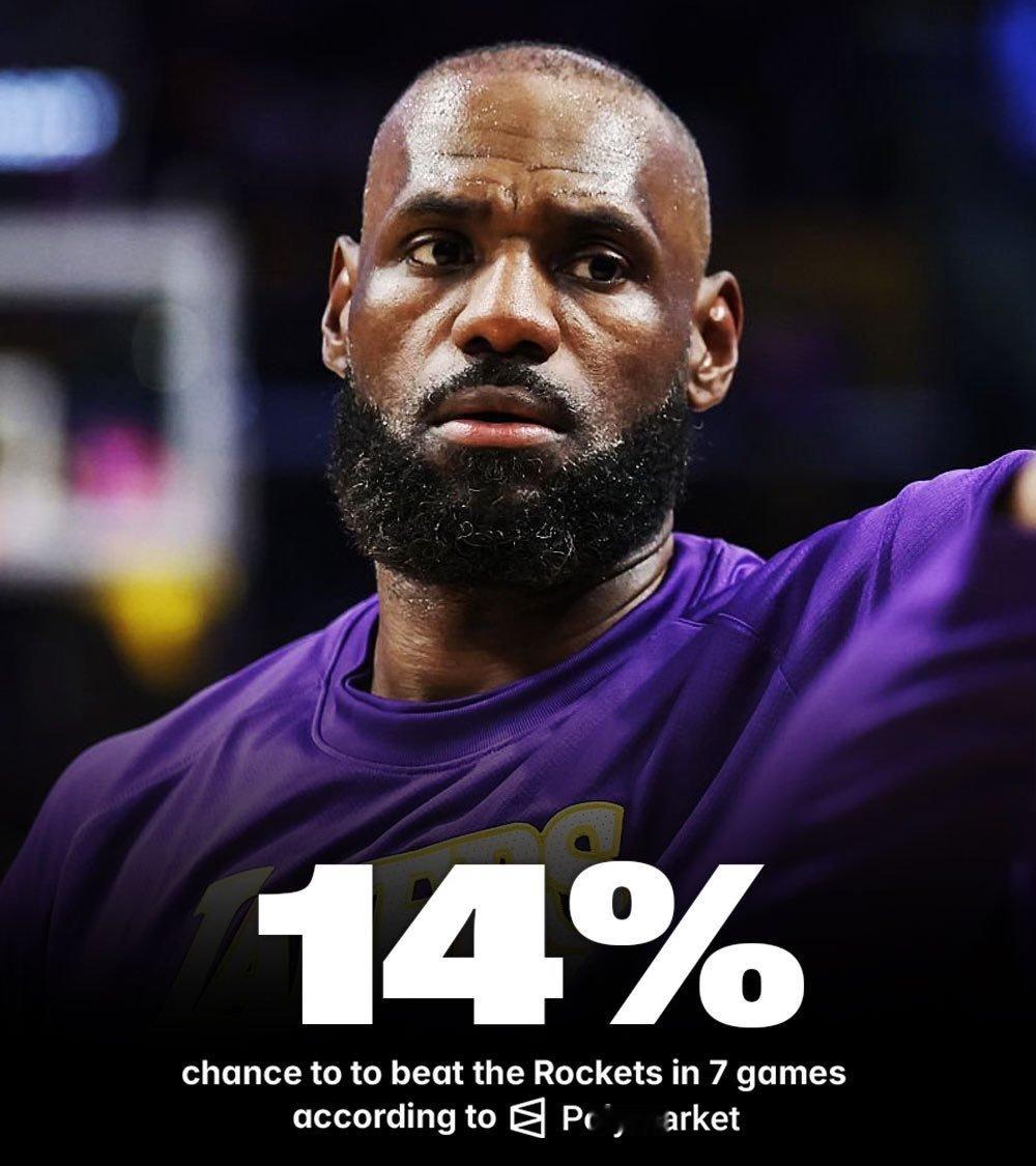 Polymarket预测湖人以4-3淘汰火箭概率为14%。