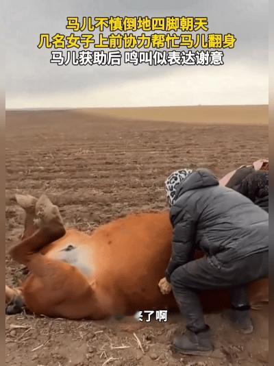 最绝的是,有人对着马儿喊“别动,我们来帮你”,那马像是听懂了,扑腾的腿立马停了,安安静静配合。几人合力一抬,马儿“咕咚”翻过来,站稳后仰头“咴儿”一声,那动静,活脱脱就是在说“谢谢”!