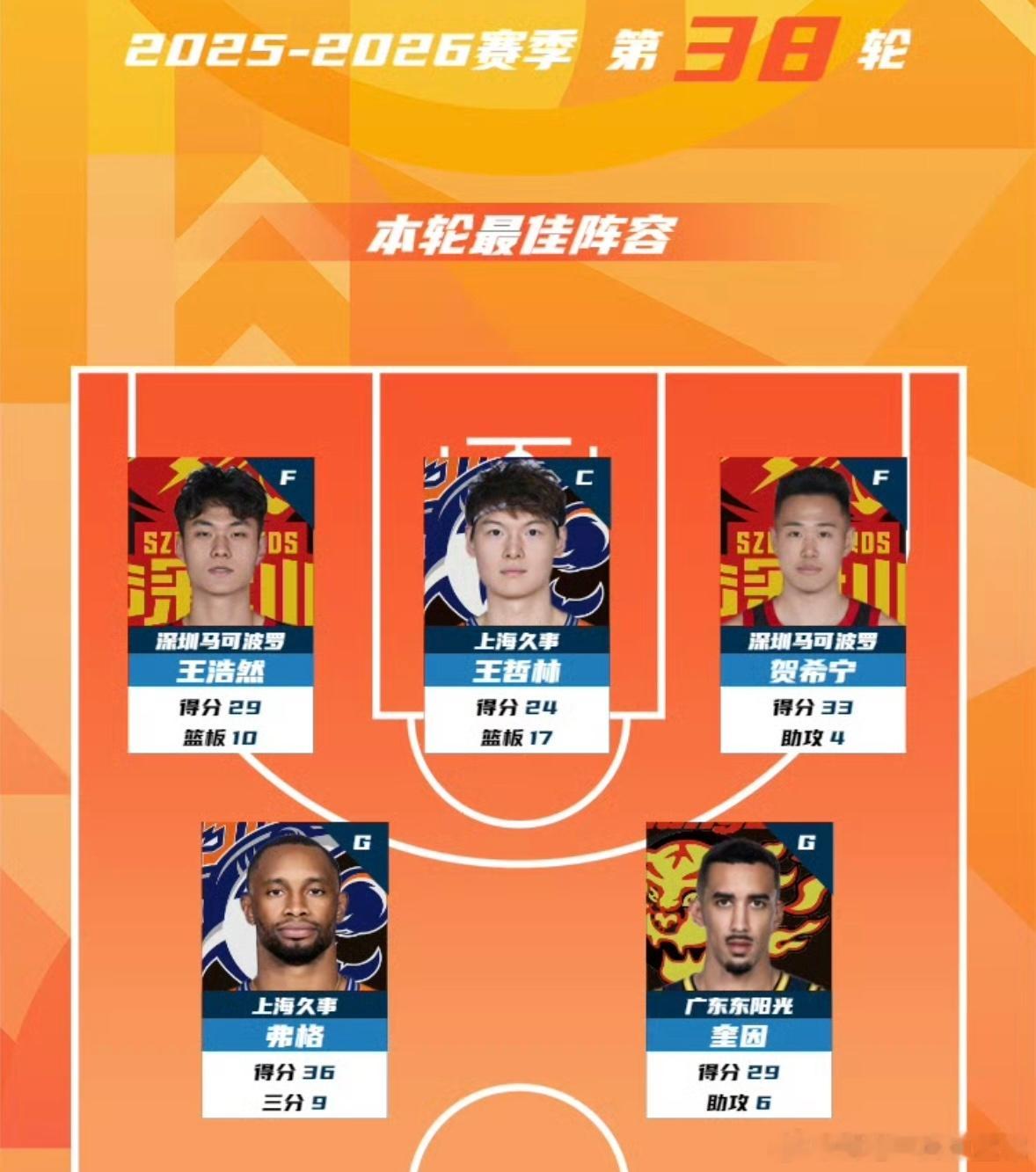 CBA第38轮最佳阵容出炉!广东深圳成大赢家CBA第38轮战罢,本轮最佳阵容正式