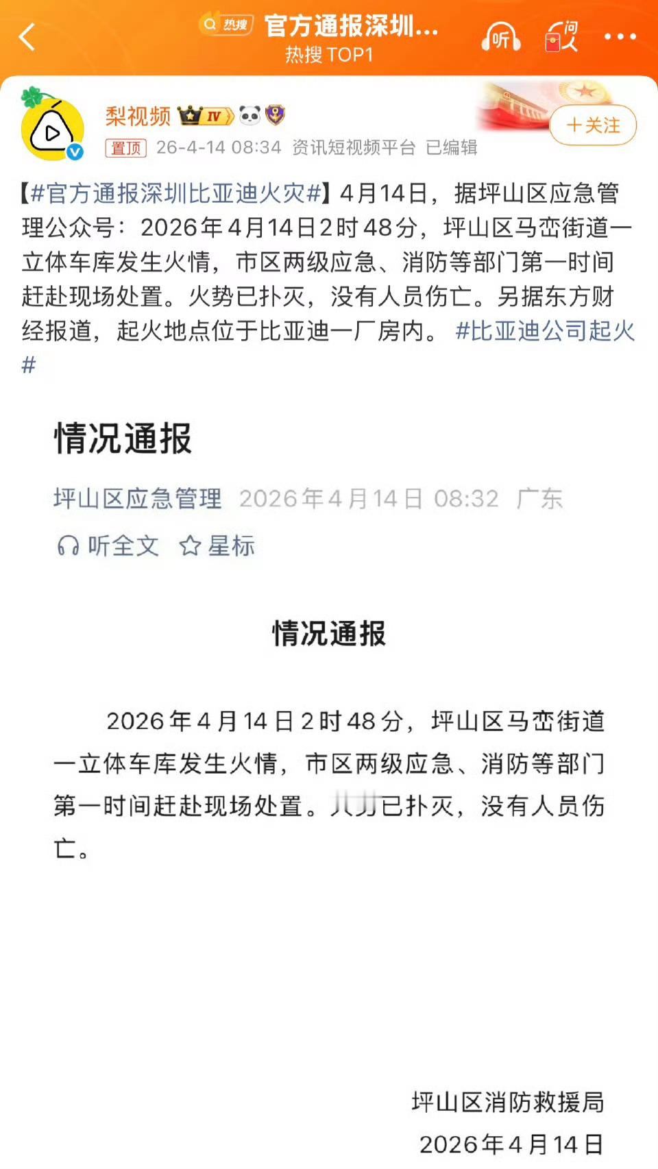 官方通报深圳比亚迪火灾不要乱传什么电池自燃了!!官方通报了是立体车库突发火灾,火势已扑灭且无人员伤亡,系外部施工单位操作不当引发。