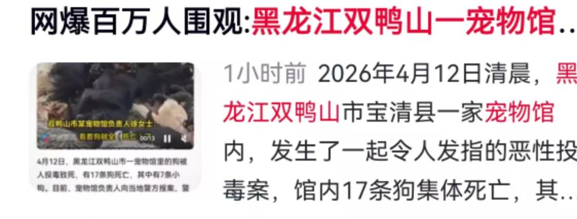 2026年4月12日清晨,黑龙江双鸭山市宝清县的一家宠物馆里,没有迎来往日的犬吠,只有死一般的沉寂。宠物馆负责人徐女士推开馆门准备喂食时,撞见了一生都难以抹去的惨状:17条狗横七竖八倒在地上,有的早已僵硬,有的还在濒死边缘痛苦抽搐。这17个生命里,有7条还是没长开的幼犬。法医学上常见的急性中毒体征毫无保留地展现在现场,死去的狗只舌头发黑、鼻腔溢出异物。这不是意外,是一场蓄意的人为屠杀。