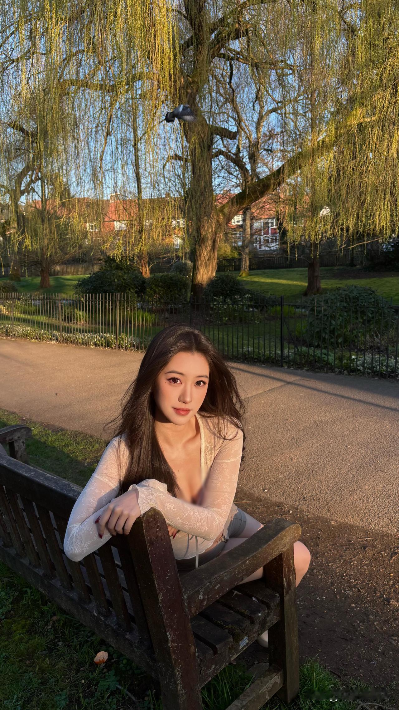 阳光下的优雅时光,漫步在公园长椅上,享受宁静与美好。穿搭 怎么发拍照才有高级感