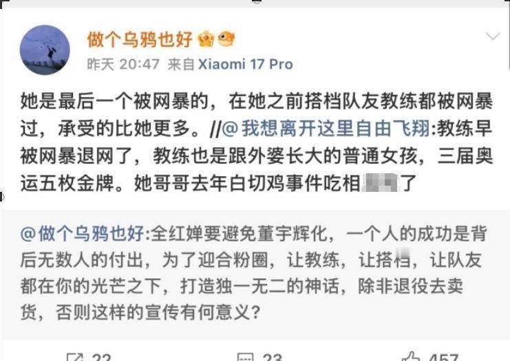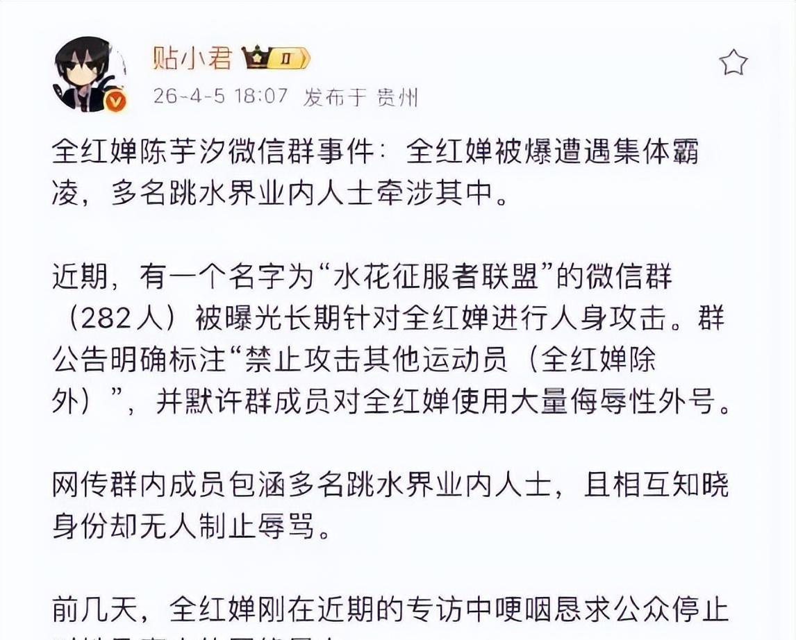 她发文阴阳怪气,指责全红婵在队友和教练挨骂的这两三年里保持沉默。