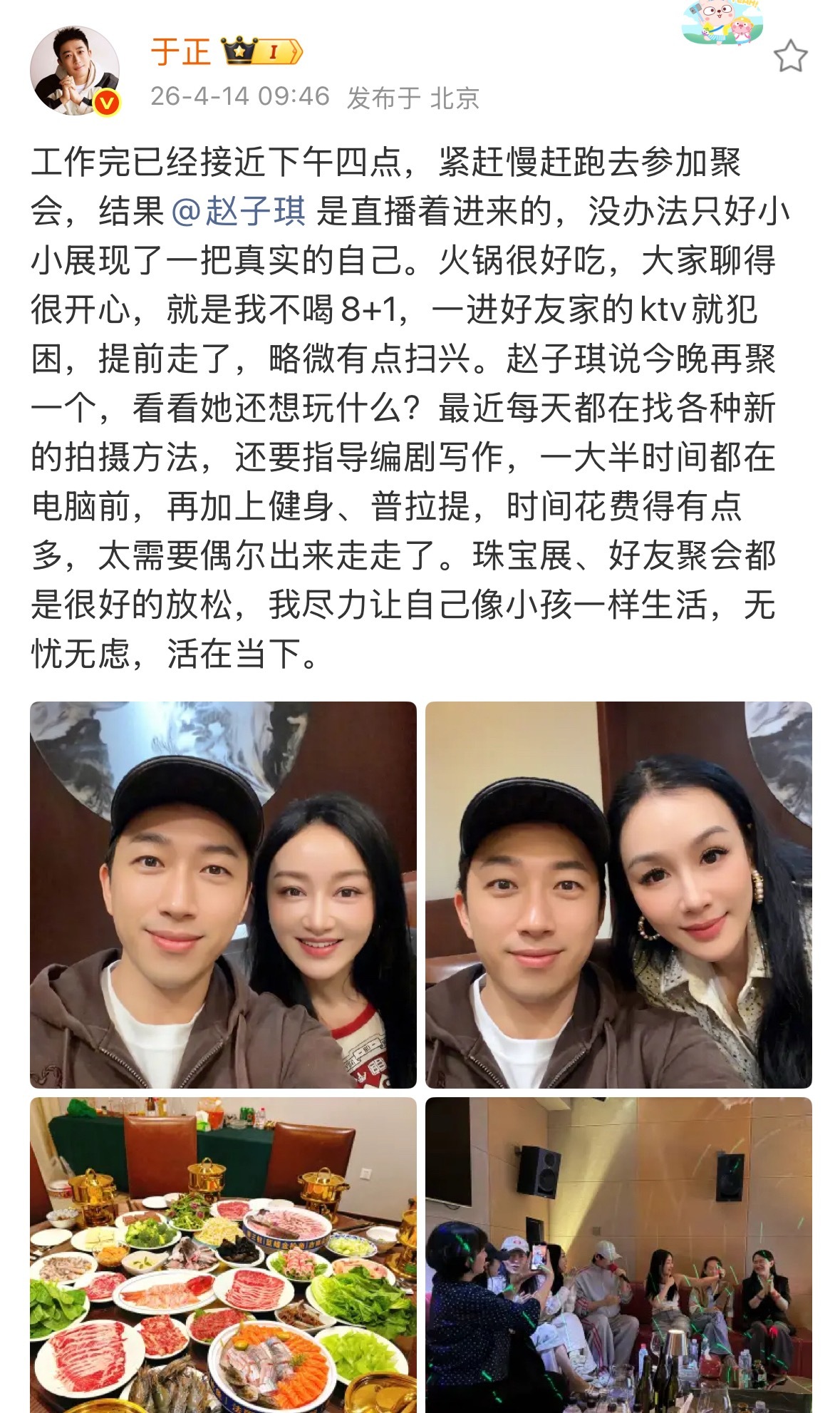 于正赵子琪合照于正晒与赵子琪合照 于正昨日聚餐照🈶于正晒了和赵子琪的合照,两人