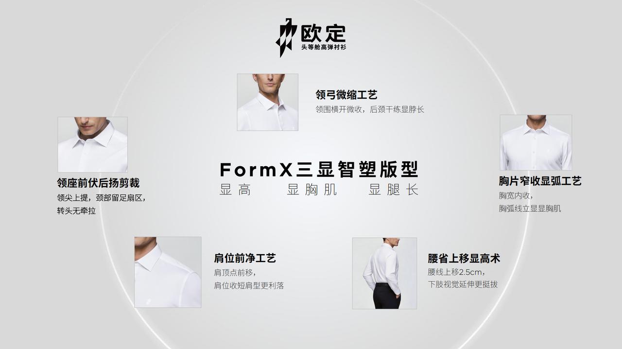 最近的发布会上,欧定公开了FormX三显智塑版型,通过调整肩线、腰线和下摆的比例,在视觉上拉长腿部线条,突出胸肌轮廓,收窄腰部宽度。简单说,就是让穿的人更显高、显胸肌、显腿长,更年轻显气质。