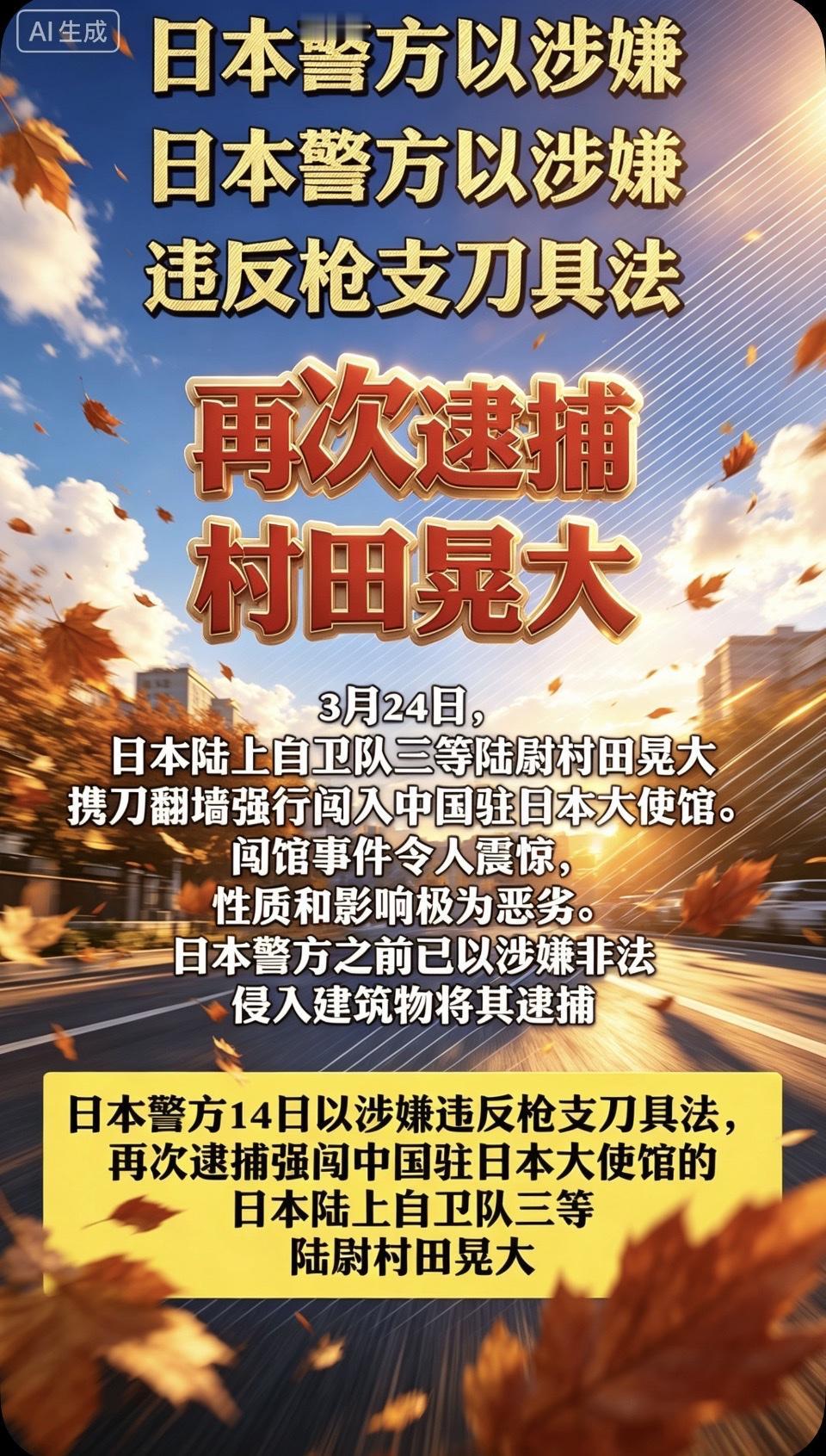 此次二次逮捕,是日方针对其“无正当理由携带刀具进入外交使团用地”的行为,以违反枪支刀具管理相关法律追加逮捕。据调查,村田在闯馆前已在东京银座购买刀具,并在使馆周边踩点近1小时,其行为严重违反《维也纳外交关系公约》,严重侵犯中国外交使团的安全与尊严,性质极其恶劣、影响极坏。