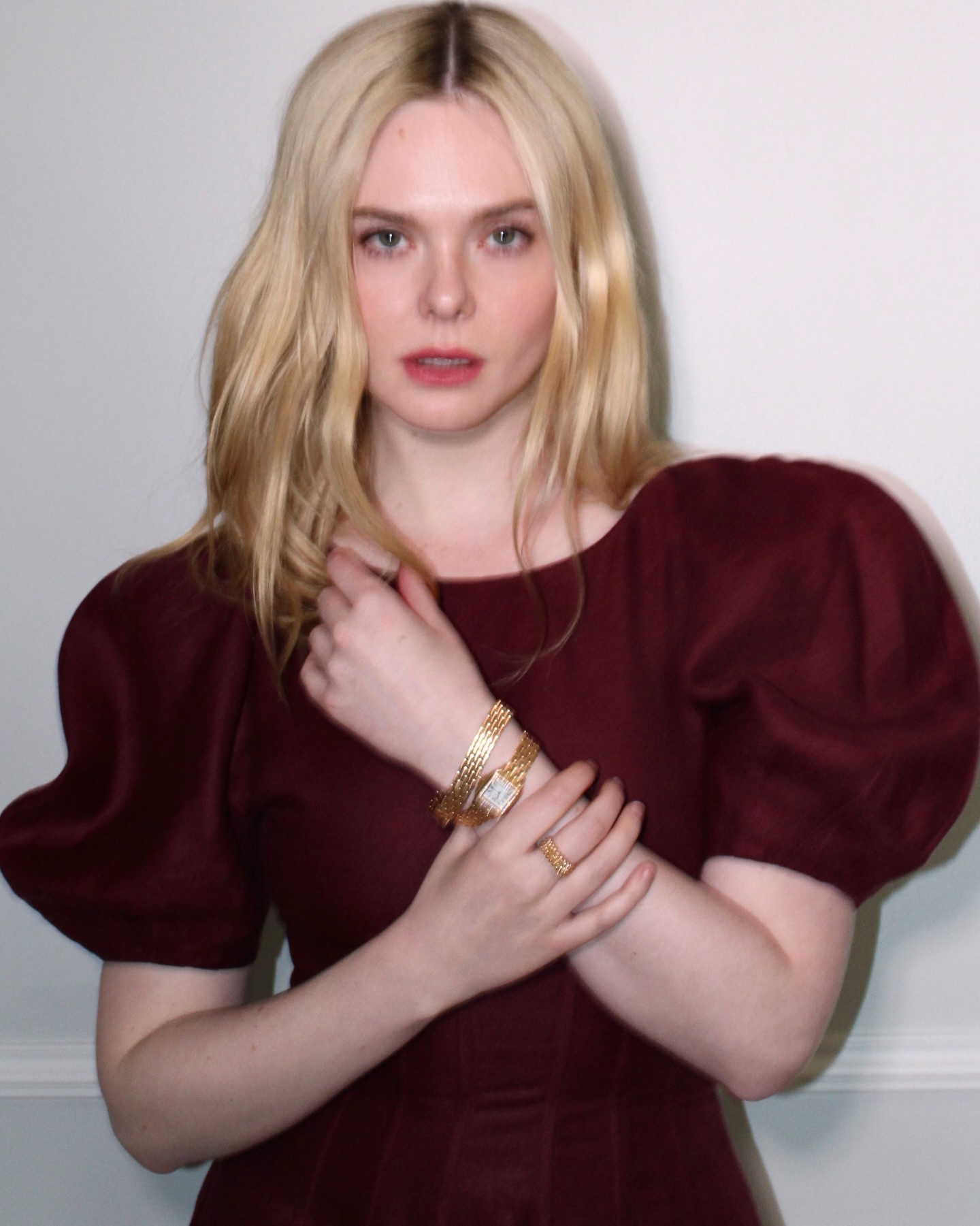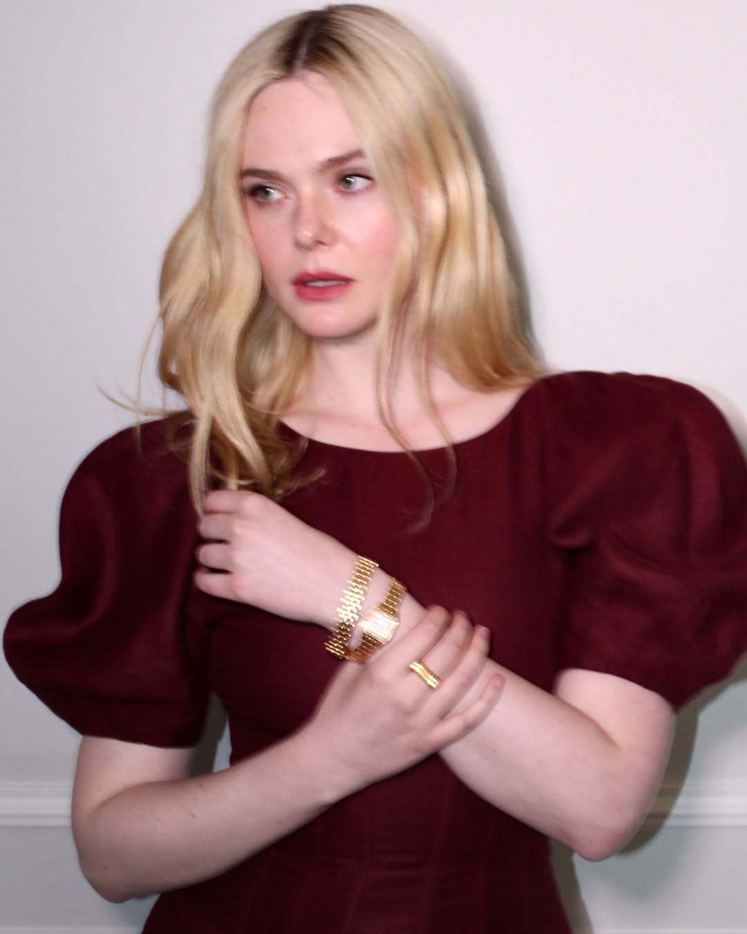 范宁Elle Fanning新风格,酒红色长裙搭配过膝皮靴摩登利落,腕间的金色Cartier腕表与戒指相当耀眼夺目,这一身偏成熟也蛮适合的🥀