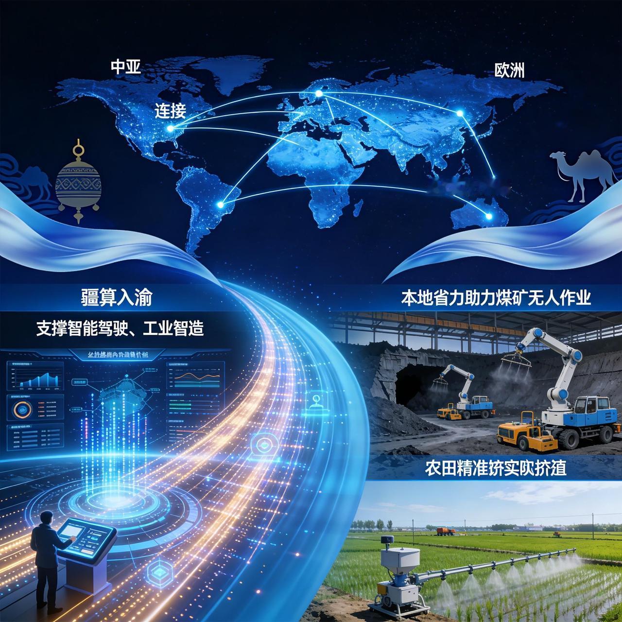 如今新疆算力已落地见效,“疆算入渝”跨区域赋能智能驾驶、工业制造,本地算力助力煤矿无人作业、农田精准灌溉。身处一带一路核心区,未来还将向中亚、欧洲输出算力,打造全球数字基建枢纽。