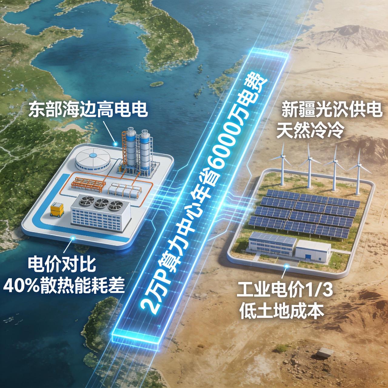 长期以来,美国靠低电价、资本和芯片垄断把持算力优势,而我国东数西算工程,让新疆成为破局突破口。算力中心超70%成本是电费,新疆风电、光伏资源全国领先,2023年工业电价仅为东部沿海的1/3,一个2万P算力中心年省电超6000万;加之干燥气候散热能耗低40%,戈壁土地成本极低,三大天然优势,让新疆成为绝佳算力基地。