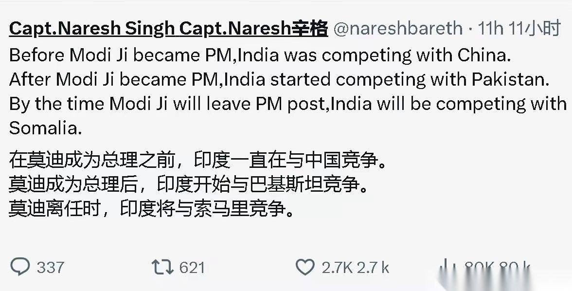 不得不说,这个印度人对莫迪的评价,是当前14亿印度人非常的少数,可惜了,他的意见,不被印度主流认可!