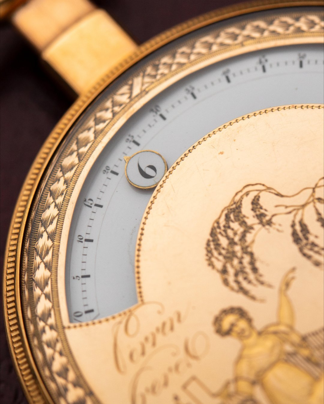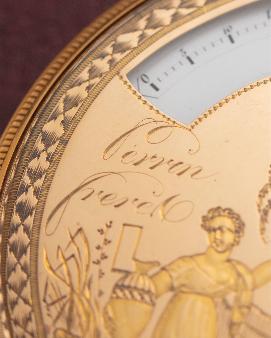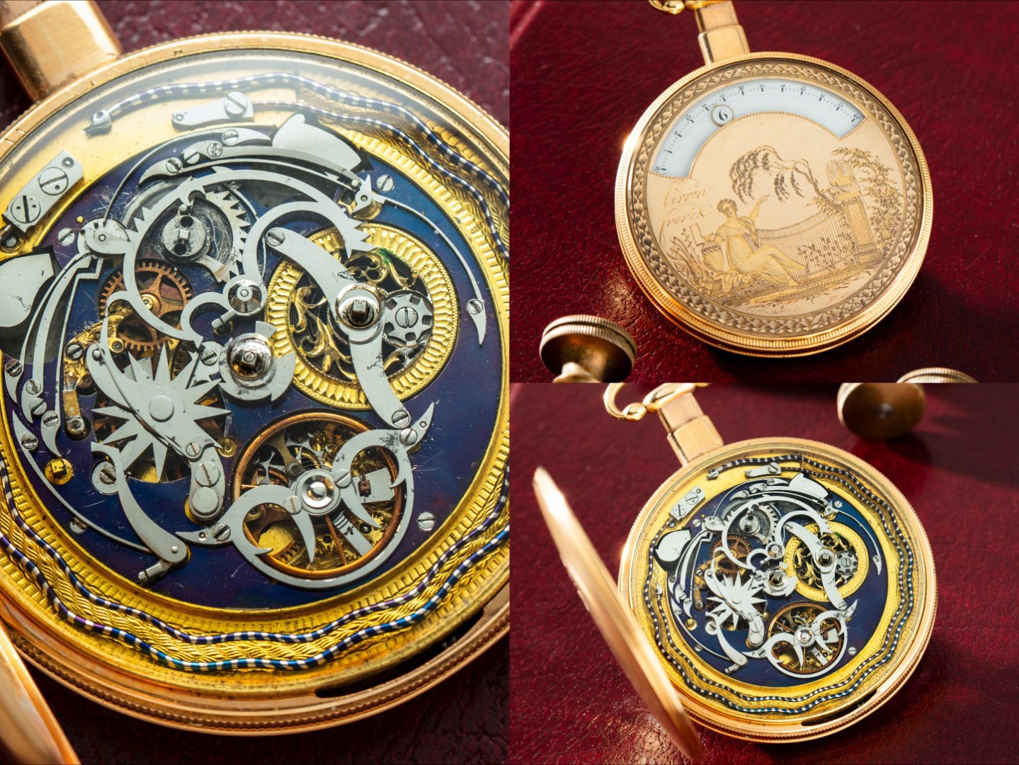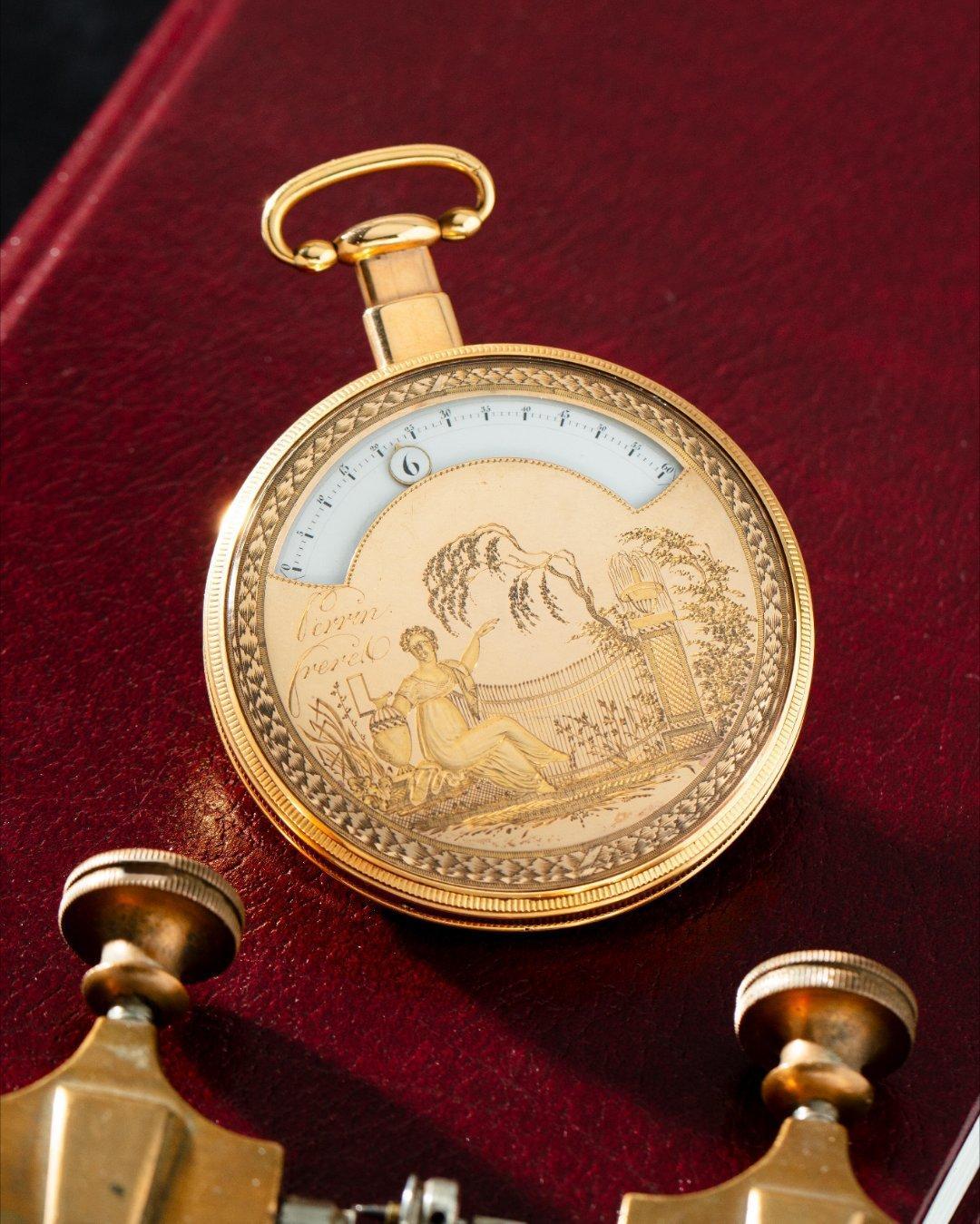 这枚约1800年由Perrin Frères于瑞士纳沙泰尔打造的黄金怀表,是19世纪早期制表工艺的巅峰见证。表壳采用精湛的刻花工艺,正面饰有人像图案,搭配独特的“漫游小时”显示:小时数字在0-60分钟刻度盘上移动,旧数字消失、新数字无缝衔接,以尖端指示分钟,兼具巧思与优雅。内部搭载鎏金机芯,外露的二问报时机构以双色蛇形波浪音簧敲击报时;芝麻链上方的镂空雕花盖板、固定三臂摆轮的抛光双臂钢桥,每一处细节都是艺术品,融合工字轮擒纵机构,历经两个多世纪仍摄人心魄。这件稀世时计完美平衡了艺术美学与机械巧思,堪称古董制表的瑰宝。钟表与奇迹2026高手带路看表展钟表与奇迹制表工艺