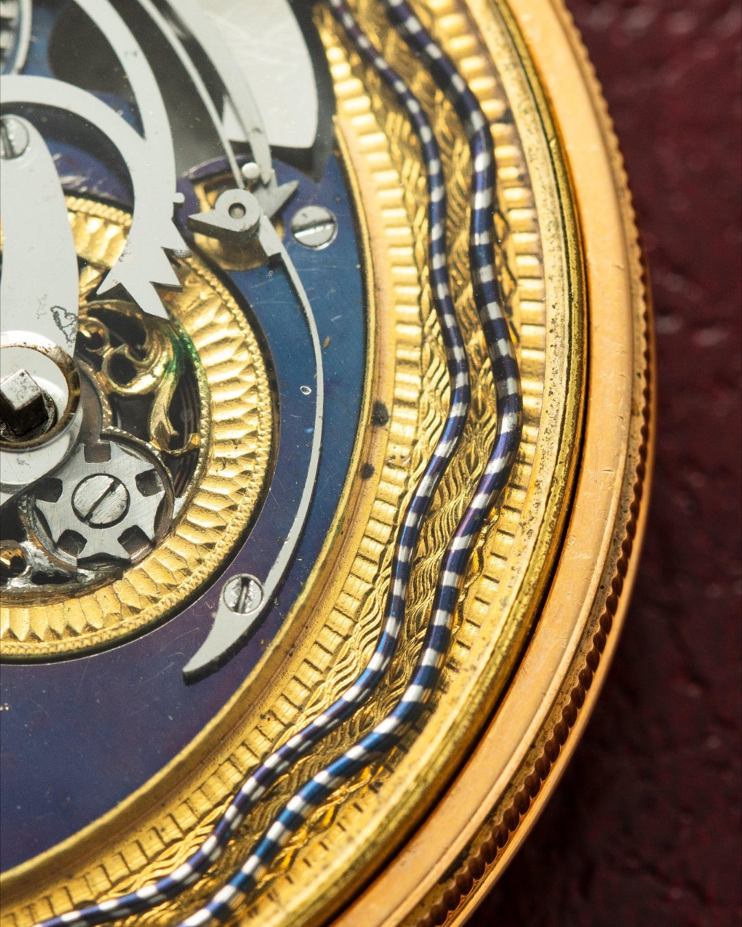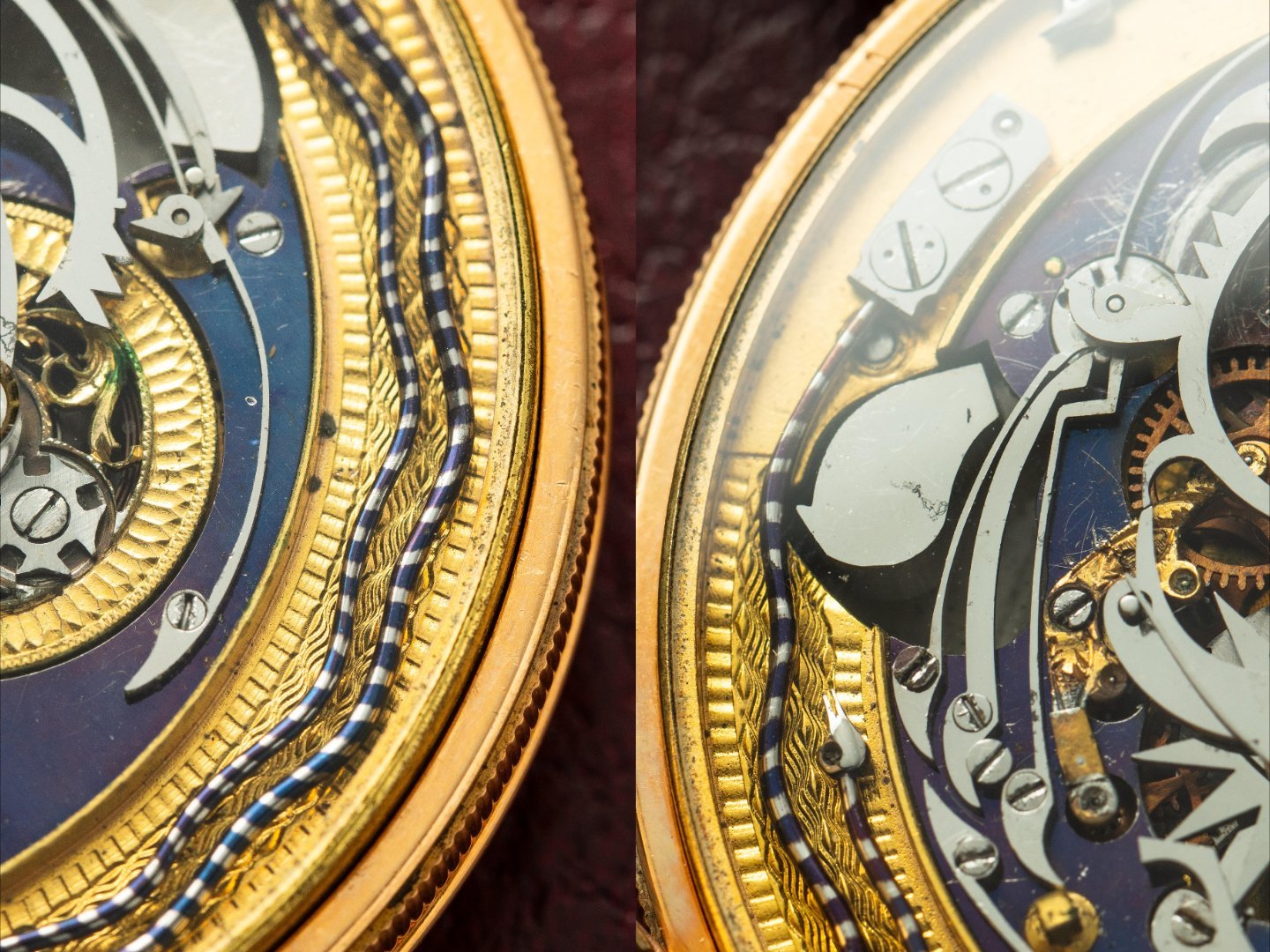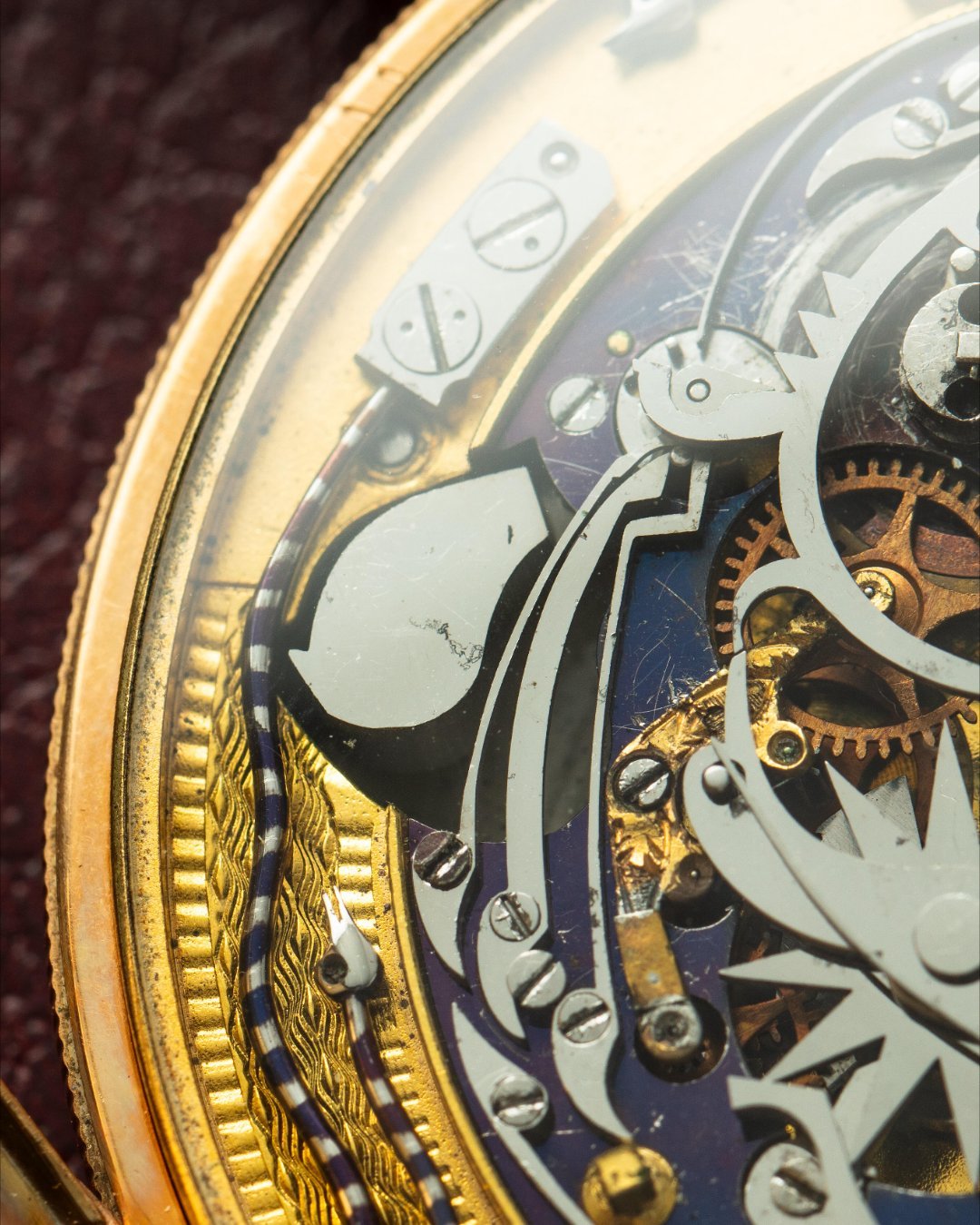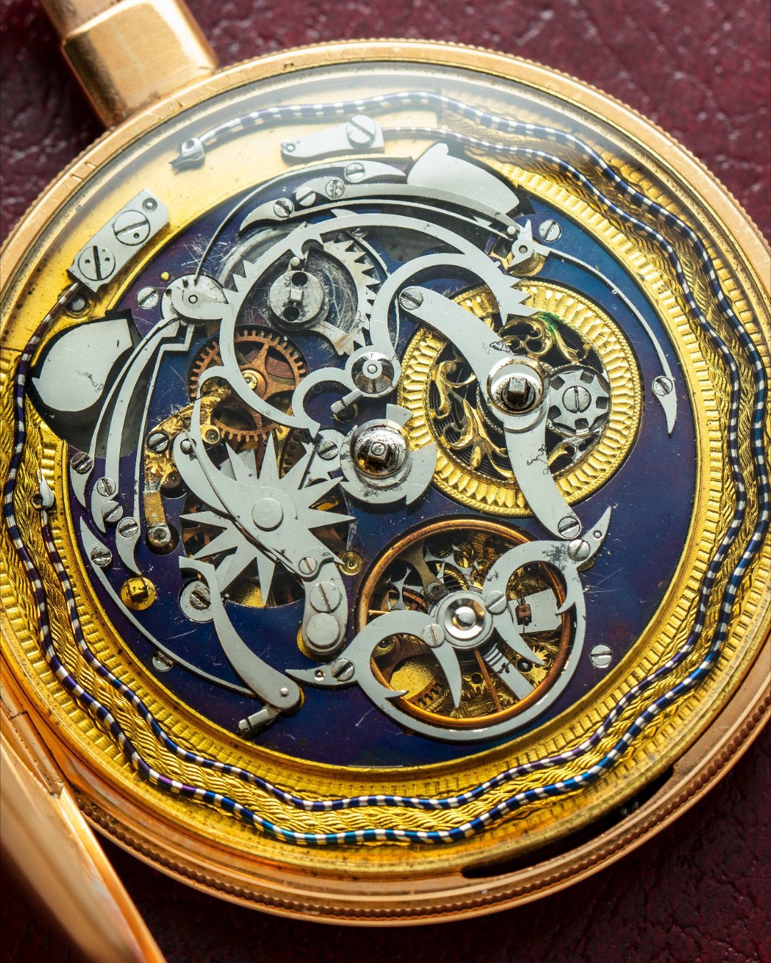 这枚约1800年由Perrin Frères于瑞士纳沙泰尔打造的黄金怀表,是19世纪早期制表工艺的巅峰见证。表壳采用精湛的刻花工艺,正面饰有人像图案,搭配独特的“漫游小时”显示:小时数字在0-60分钟刻度盘上移动,旧数字消失、新数字无缝衔接,以尖端指示分钟,兼具巧思与优雅。内部搭载鎏金机芯,外露的二问报时机构以双色蛇形波浪音簧敲击报时;芝麻链上方的镂空雕花盖板、固定三臂摆轮的抛光双臂钢桥,每一处细节都是艺术品,融合工字轮擒纵机构,历经两个多世纪仍摄人心魄。这件稀世时计完美平衡了艺术美学与机械巧思,堪称古董制表的瑰宝。钟表与奇迹2026高手带路看表展钟表与奇迹制表工艺