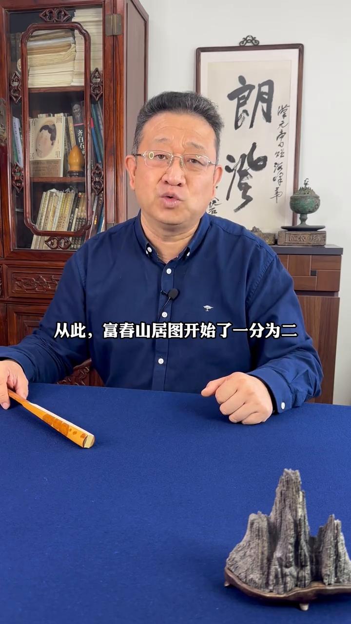 又过了一百多年,富春山居图再现江湖,到了宜兴一个吴姓藏家的手里,他对富春山居图爱不释手,临终前居然交代家人把它烧了陪我。关键时刻是他侄子把画从火盆里边又给救了出来,不过还是被烧成两段,上半段叫《剩山图》,下半段是主体叫《无用师卷》。