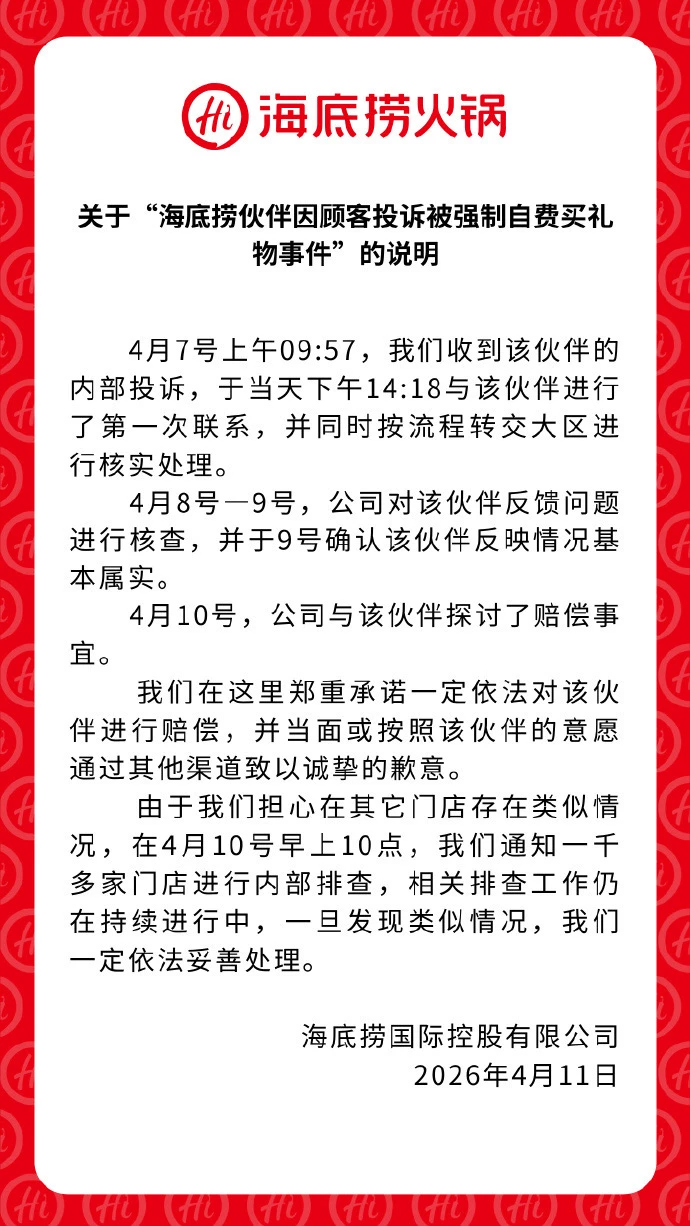 昨日晚间,海底捞发布《关于“海底捞伙伴因顾客投诉被强制自费买礼物事件”的说明》。海底捞方表示,“4月8号一9号,公司对该伙伴反馈问题进行核查,并于9号确认该伙伴反映情况基本属实。4月10号,公司与该伙伴探讨了赔偿事宜。”