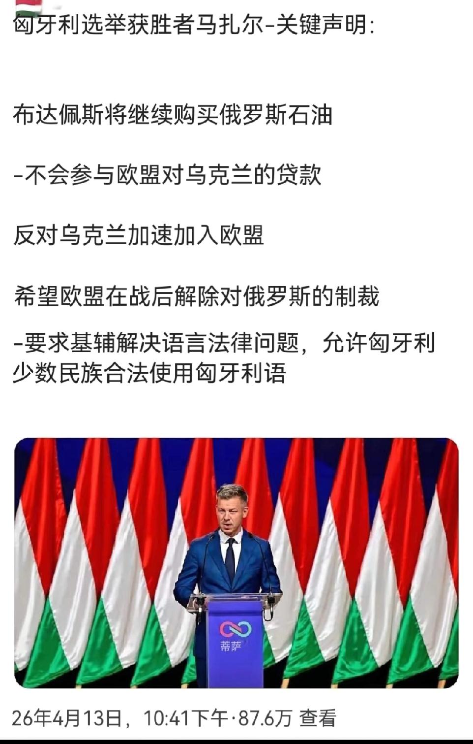 看了匈牙利新当选总理马加尔的声明,不开心的会有两个人:泽连斯基和冯德莱恩!