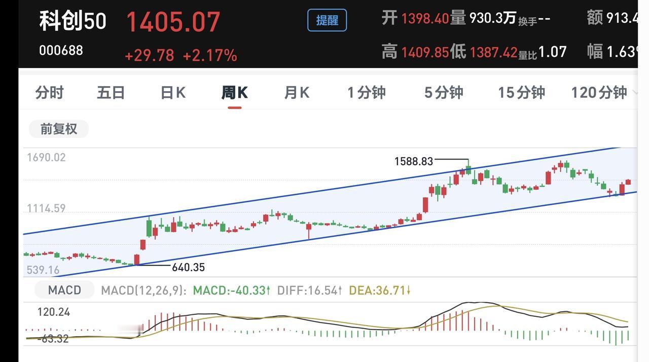 科创50板块周线级别处于上涨通道中,上周的最低点就是调整到了这个上涨通道的下轨线上,这个板块现在保持着上涨趋势,只要还能保持在这个上涨通道内,长线持有的人都可以继续持有的人。