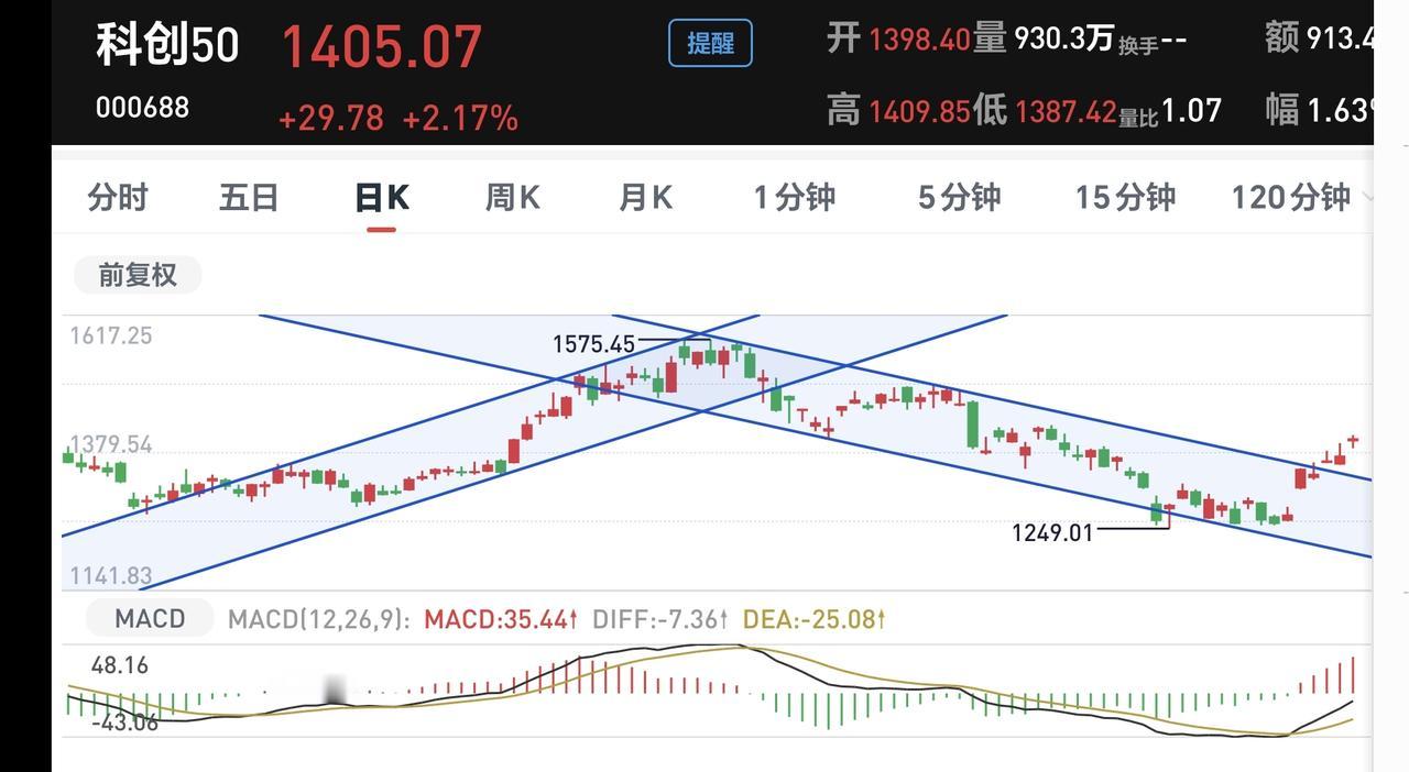 科创50板块上周五上涨突破了日线级别下跌通道的上轨线,本周的两个交易日都是在上涨通道的上方震荡,已经形成了有效突破,短线的人可以考虑要不要进场。