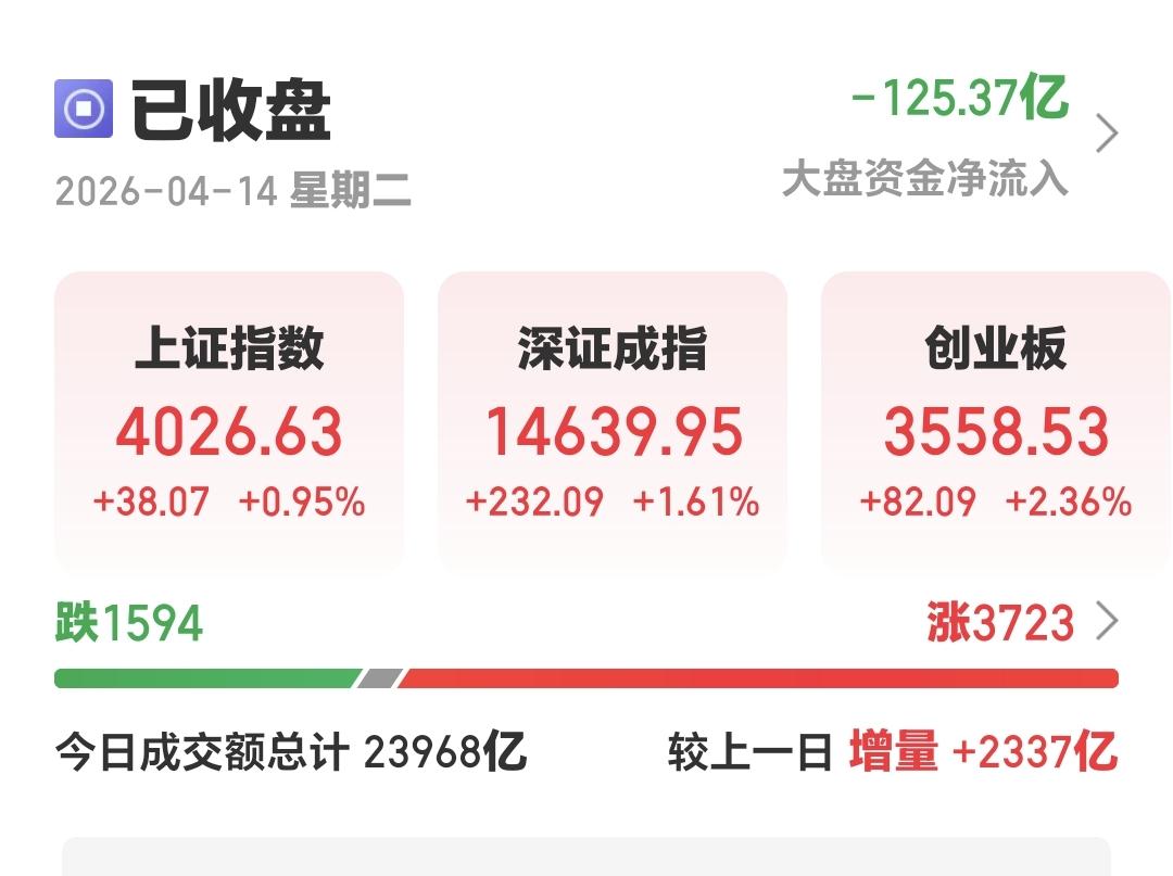 今天两市累计成交23968亿,相比于昨天放量了2337亿,主力资金净流出125亿,今天,虽然相比于昨天放量了2000多亿,但总的成交量只有2万3000多亿,25000亿以下的成交量,都不要指望它能够站稳4000点,况且,今天主力资金还净流出125亿,这也是我今天没有进场的原因。