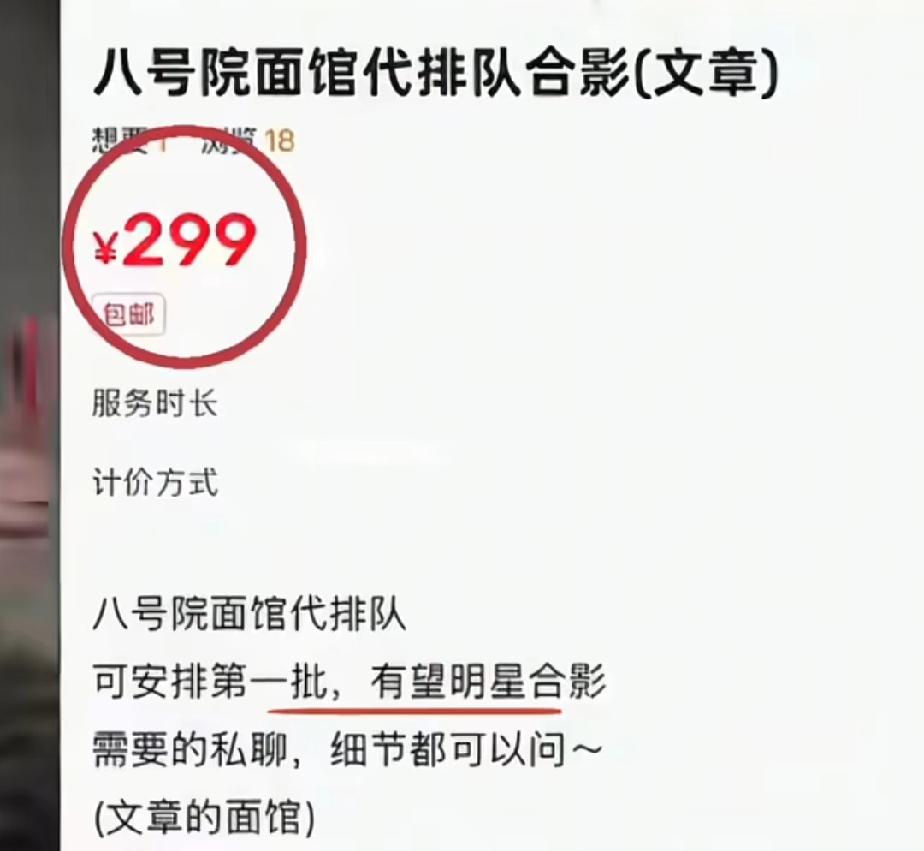 看到排队的人这么多,网上甚至还出现了代排队服务,价格被炒到了299一位,宣称去文章店里吃面有机会和明星合影,说真的这价格比吃文章店里的面都要贵了。