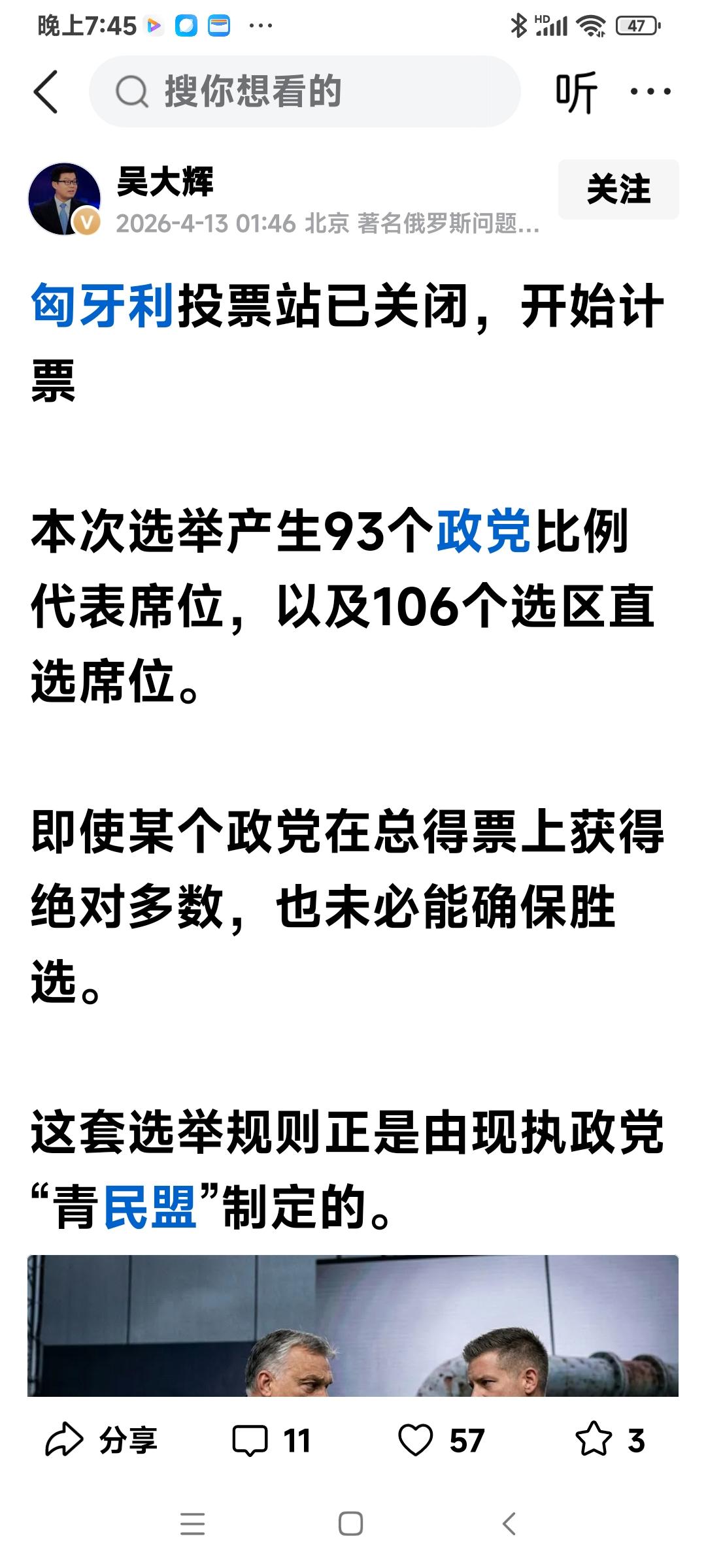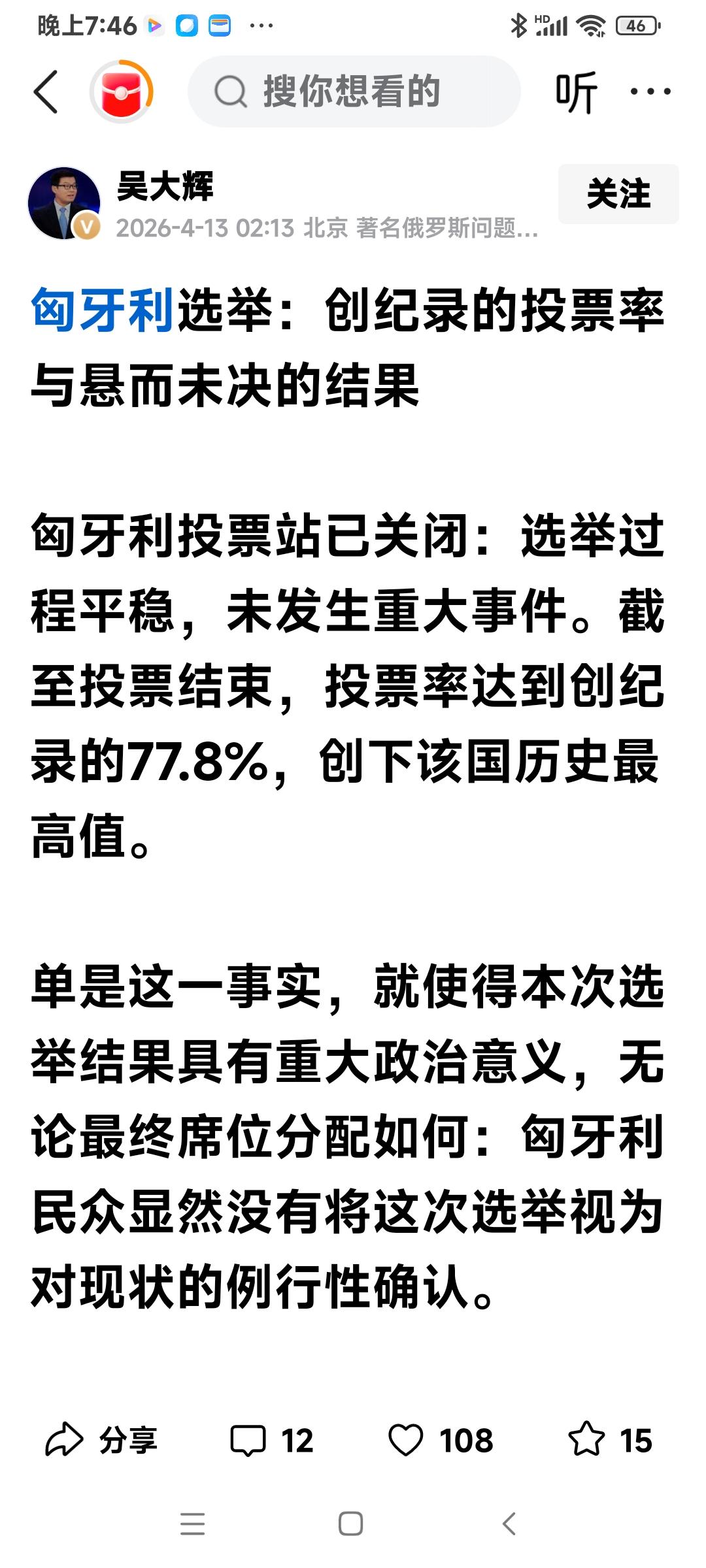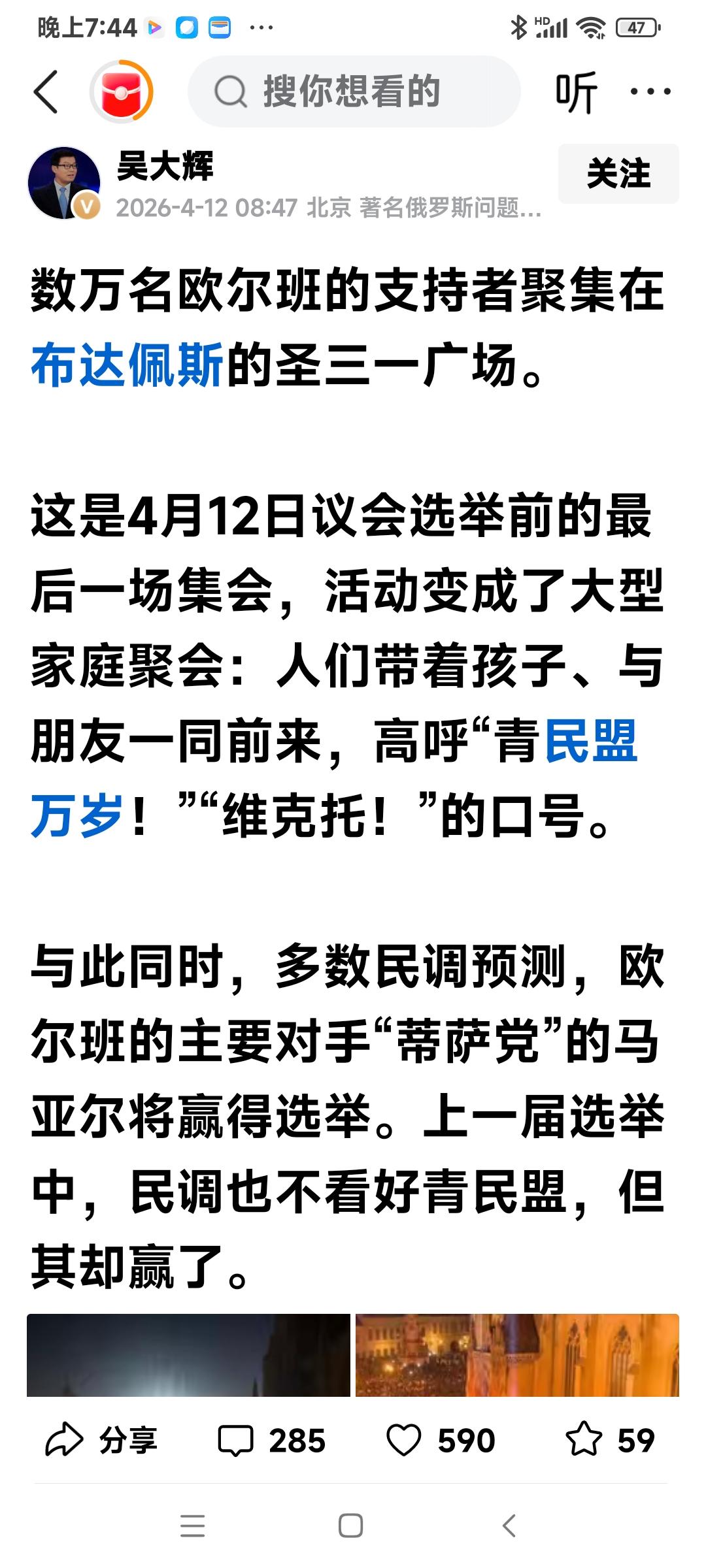 我国著名的俄罗斯问题专家,清华大学国际关系学系教授吴大辉先生,本来对匈牙利的大选是非常关注的,即使4月12日投票结束了,还看好欧尔班,直到欧尔班自己承认败选才嘎然而止。