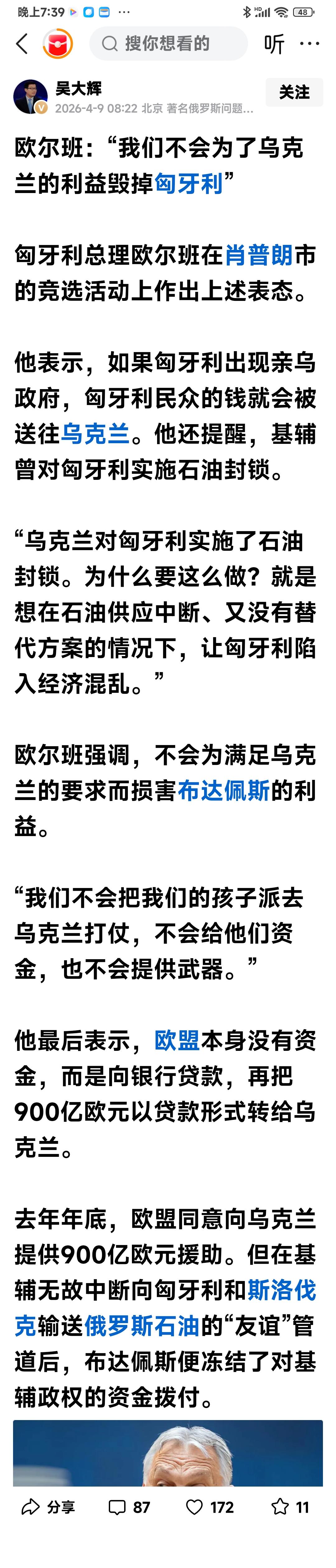 其实我觉得吴大辉教授将欧尔班败选责任,全部归于万斯和特朗普也是不公平的,这本身欧尔班自己要承担主要责任,支持俄罗斯,反对乌克兰,挑战欧盟……应该是重要的内因,如果要说外部因素的话,万斯特朗普的助选应该算一个,但东大的支持者包括吴大辉在内也是功不可没的。