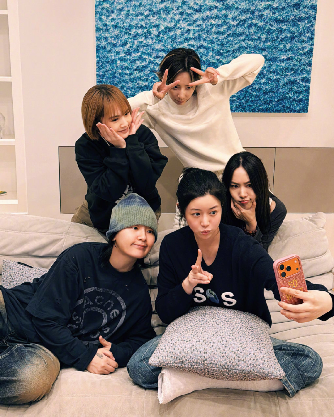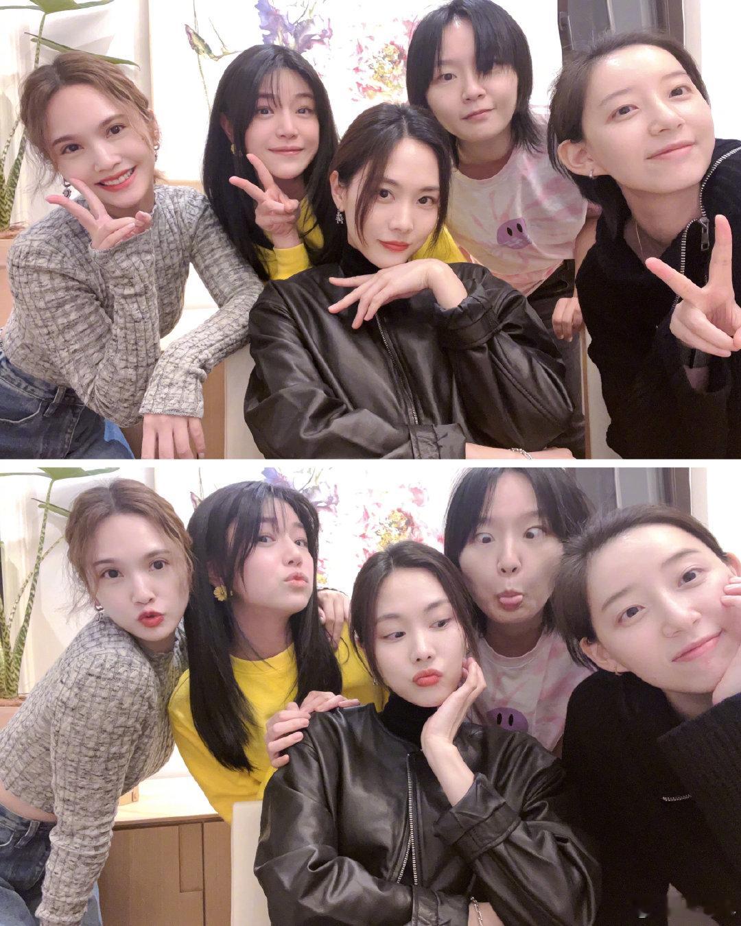 三位徐姓美女与具俊晔的同框照:蹲在前排的徐熙娣柳眉杏眼,笑容可掬;秀发垂肩的
