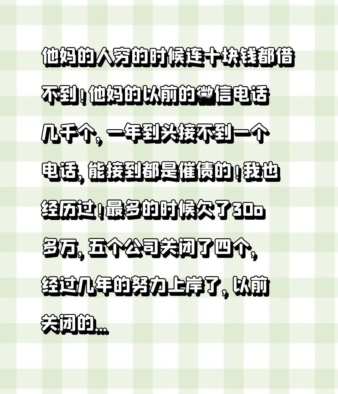 人在低谷时,世态炎凉尽显。我太懂那种人穷时连十块钱都借不到的滋味了,曾经微信电话好友几千个,一年到头没几个问候电话,打来的全是催债的。我最惨的时候欠了300多万,五个公司关了四个,感觉天都要塌了。