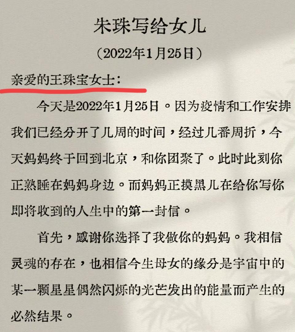 在女士王宝珠刚出生四个月时,就收到了妈妈写给她的第一封信,信的开头没有以亲爱的宝贝或女儿称呼,而是王宝珠女士,这时朱珠就把女儿当独立个体对待了,以平等姿态与她对话。