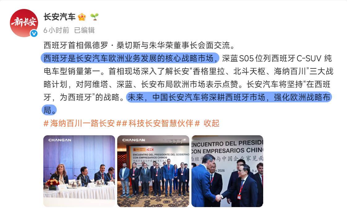 西班牙首相桑切斯昨天到访小米,今天到访长安汽车,目前看来各自目标都非常明确,小米汽车为2027年出海欧洲做铺垫,长安汽车则是深耕西班牙市场,强化欧洲战略布局。