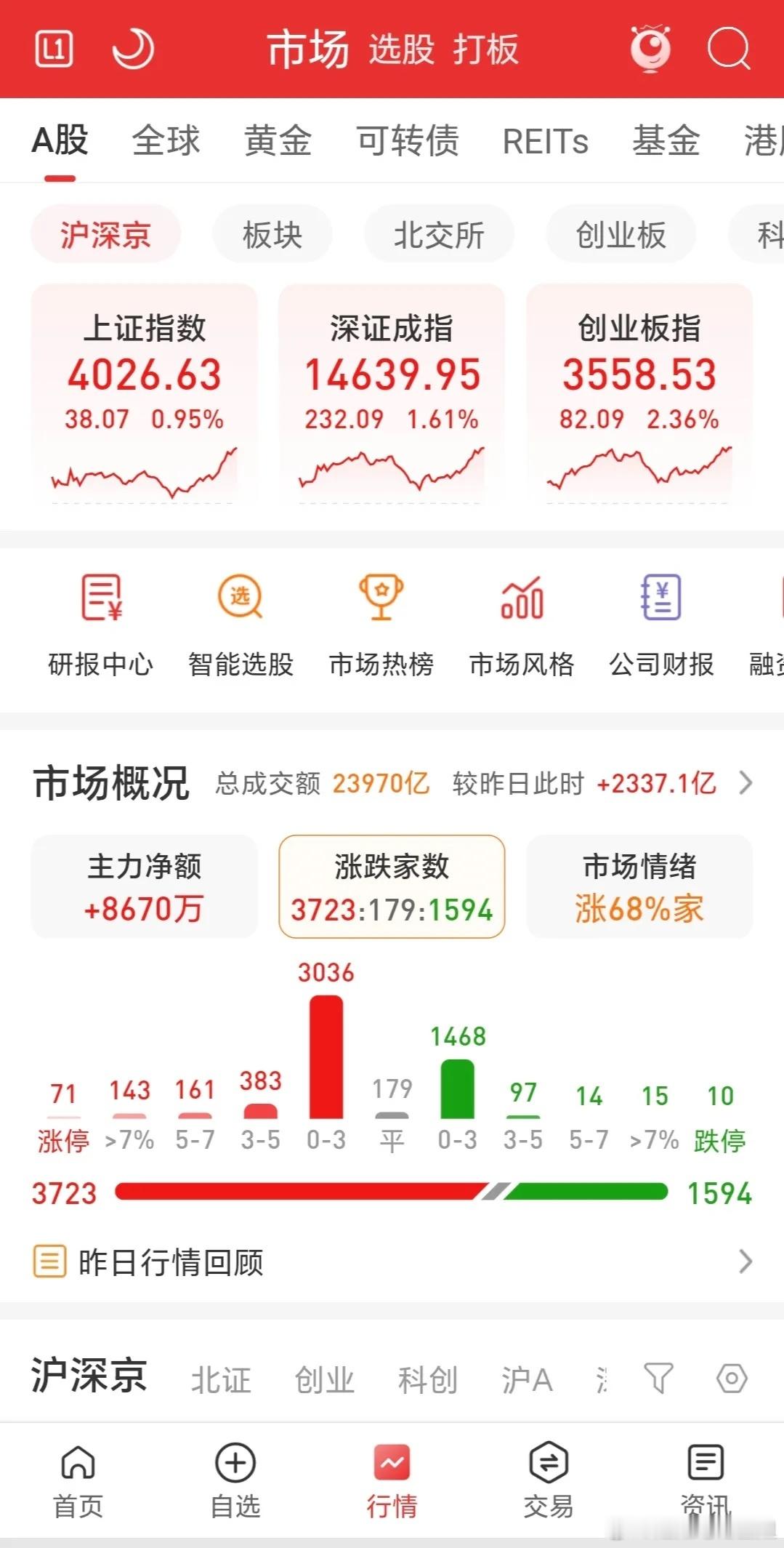 三大指数高开高走,最终以中阳线报收。全天成交量达2.4万亿,较昨日增加2300亿。超3700家个股上涨,71家涨停,10家跌停,市场情绪一片向好!